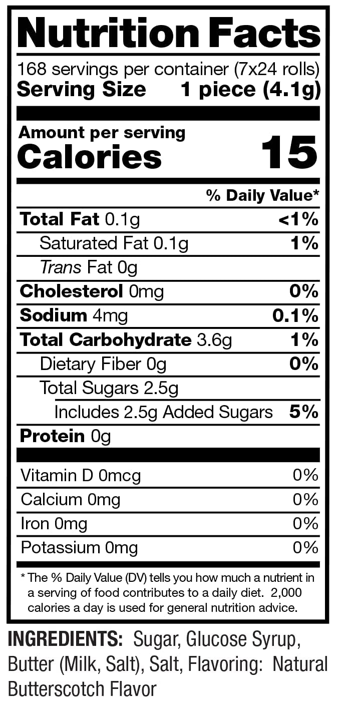 Enjoy These Tasty Butterscotch Candies Or Treat A Friend. Each Roll Has 7 Individually Wrapped Pieces For Freshness. Every Batch Is Slow-Stirred So Each High-Quality Candy Button Is Free Of Bubbles And Feels Smooth On The Tongue As It Melts Away.