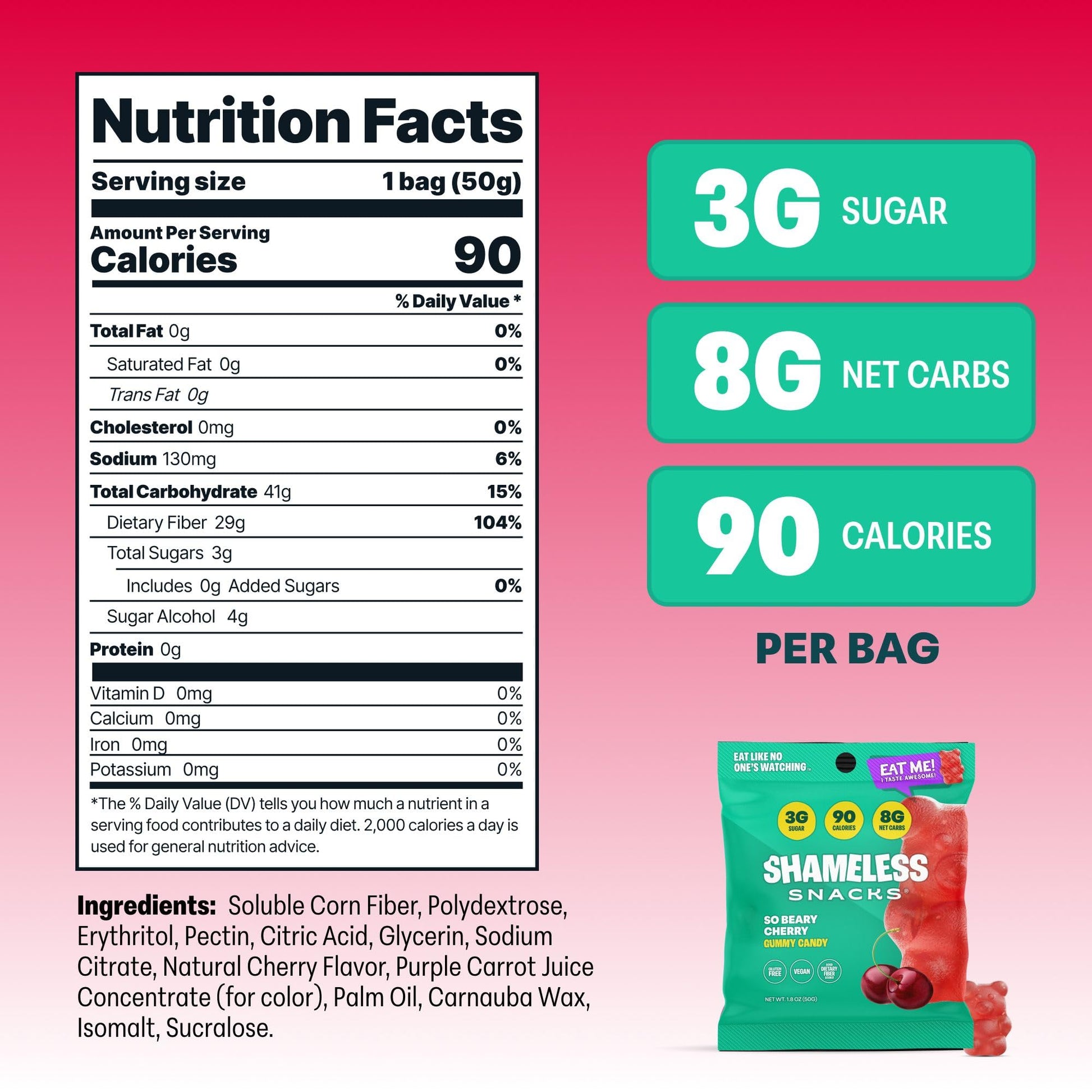 Q: What flavors are available in the Shameless Snacks 6 Pack?A: The Shameless Snacks 6 Pack features the Beary Cherry flavor, known for its sweet, juicy taste that mimics classic candy without the added sugar and calories.