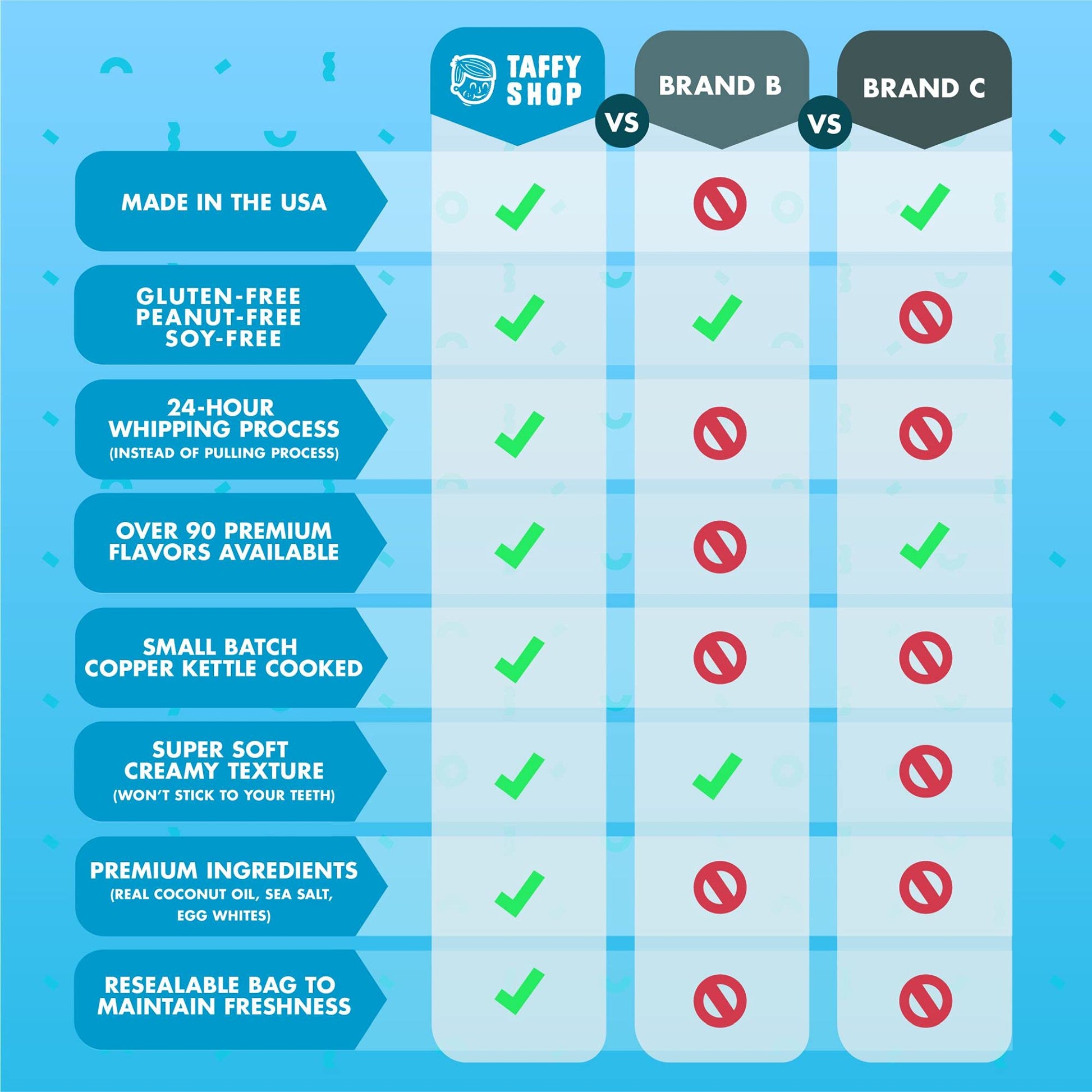 - Q: What makes Taffy Shop's saltwater taffy unique? A: Taffy Shop's saltwater taffy is unique due to our meticulous recipe perfected over 20 years, ensuring each piece is soft, chewy, and bursting with nostalgic flavors. Our small-batch production guarantees freshness and quality, making it a delightful treat.