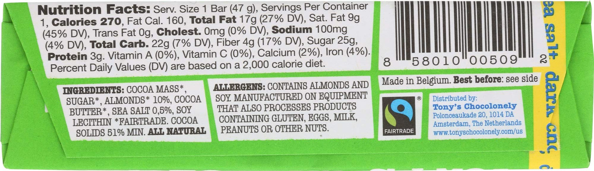 - Q: What makes Tony's Chocolonely Almond Sea Salt Dark Chocolate Bar unique? A: Tony's Chocolonely Almond Sea Salt Dark Chocolate Bar is unique due to its combination of crunchy almonds and sea salt with a rich 51% dark chocolate base. It not only satisfies your sweet and salty cravings but also supports Fairtrade practices aimed at achieving slave-free chocolate worldwide.
