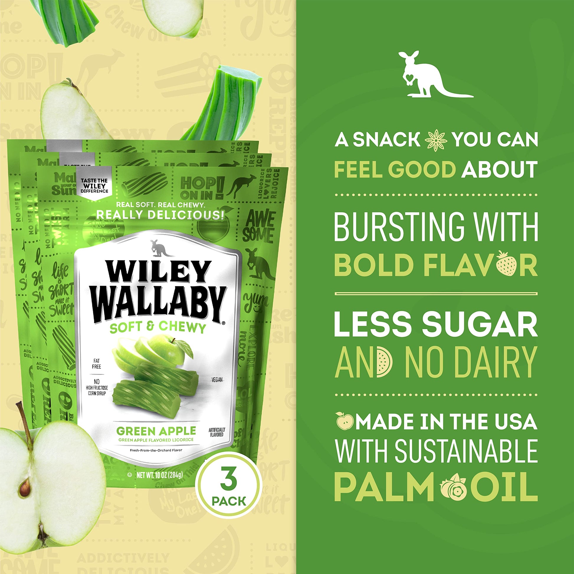 Q: How does the flavor of green apple licorice compare to other flavors?A: The green apple flavor of Wiley Wallaby Licorice offers a unique, fruity taste that is both refreshing and sweet, setting it apart from traditional licorice flavors and making it a delightful treat for candy lovers.