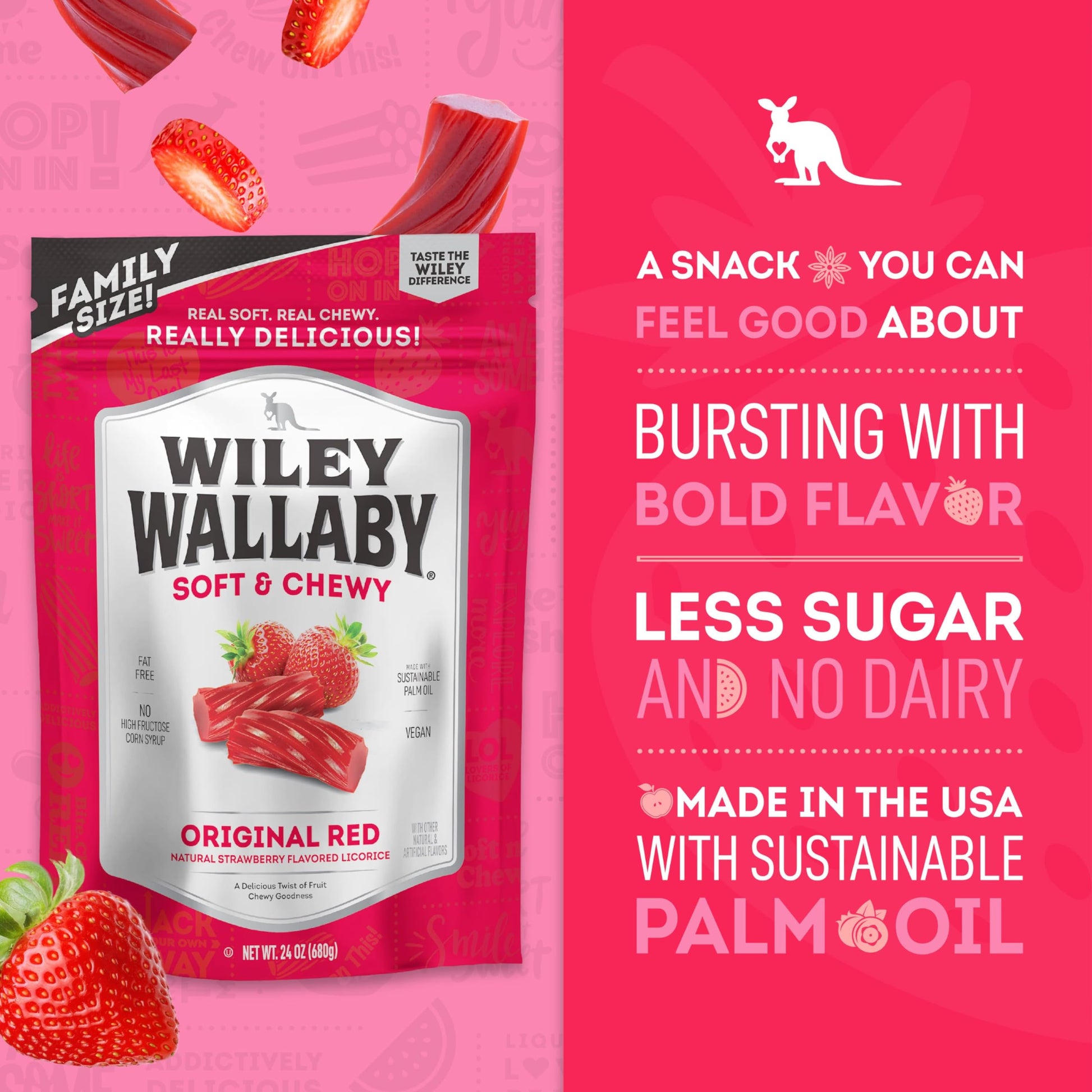 Licorice Lovers Rejoice Finally That Tough, Flavorless Licorice Can Be A Thing Of The Past. Wiley Wallaby Licorice Has Big Bold Flavors And A Soft Chewy Texture Your Heart (And Stomach) Really Desires! Bff: Best Fruit Flavor We Packed Wiley So Full Of Fresh Fruit Flavors, There Was Less Room Left For The Things You Could Do Without. Less Sugar, Fat Free And Absolutely No Dairy Or High Fructose Corn Syrup - Now Your Conscience Can Be Clear While You Enjoy Our Our Wiley Fruit Flavors. Win-Win-Win! Bite. Chew. Smile. Repeat. Whether On Your Own Or With Your Favorite People, Wiley Makes The Perfect Mess-Free Snack Anytime, Anywhere! So The Next Time You'Re Headed To The Movies, Out On A Hike, Or Meeting Up With Friends, Grab A Bag Of Wiley. Explore More We Believe That ''Status Quo'' Isn'T Always Best. That'S Why We Continually Develop New Products And Flavors.