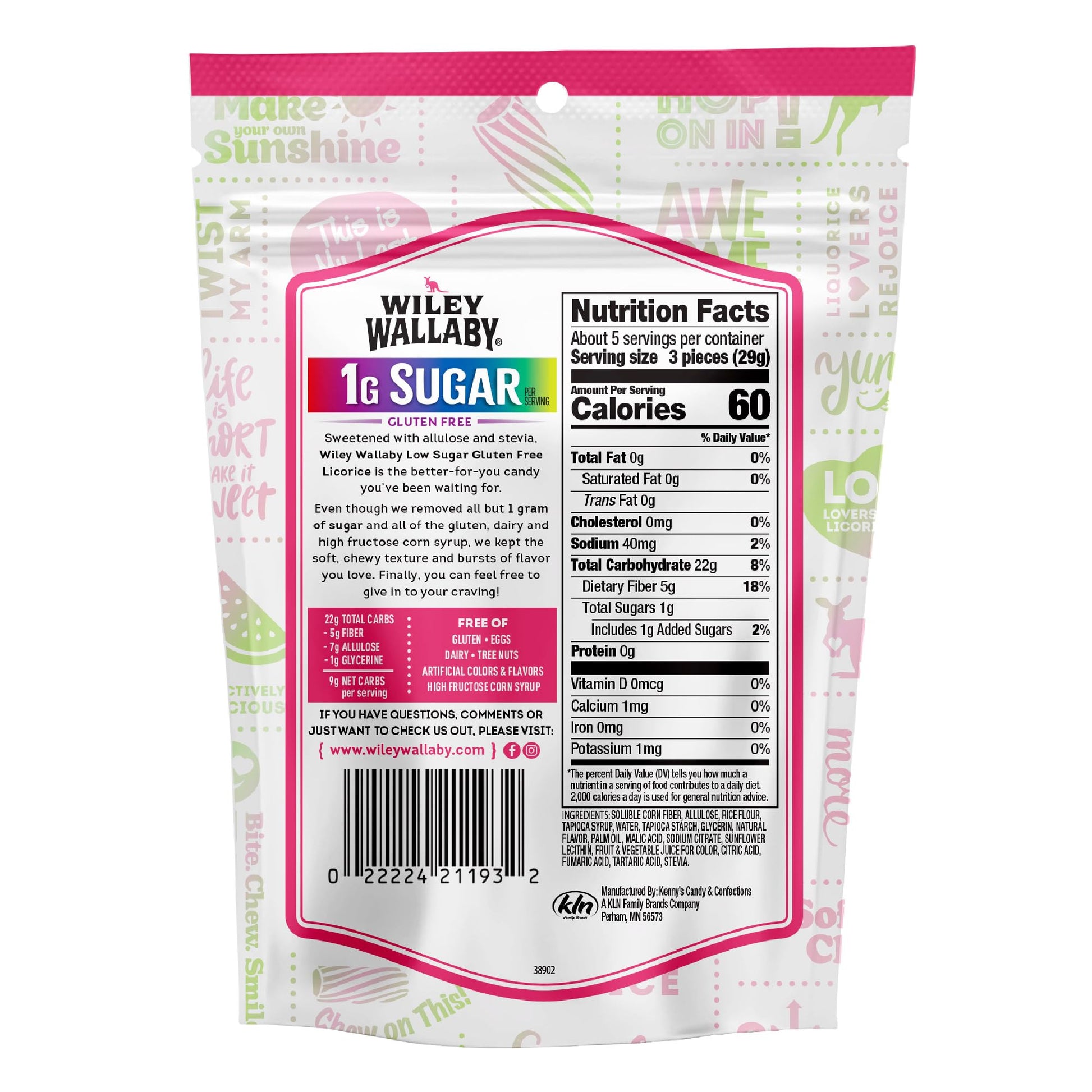 Q: What makes Wiley Wallaby Licorice a healthier candy option?A: Wiley Wallaby Licorice is a healthier candy choice because it contains only 1 gram of sugar per serving, making it low calorie and low carb. It's also gluten-free, fat-free, and does not include dairy or high fructose corn syrup.