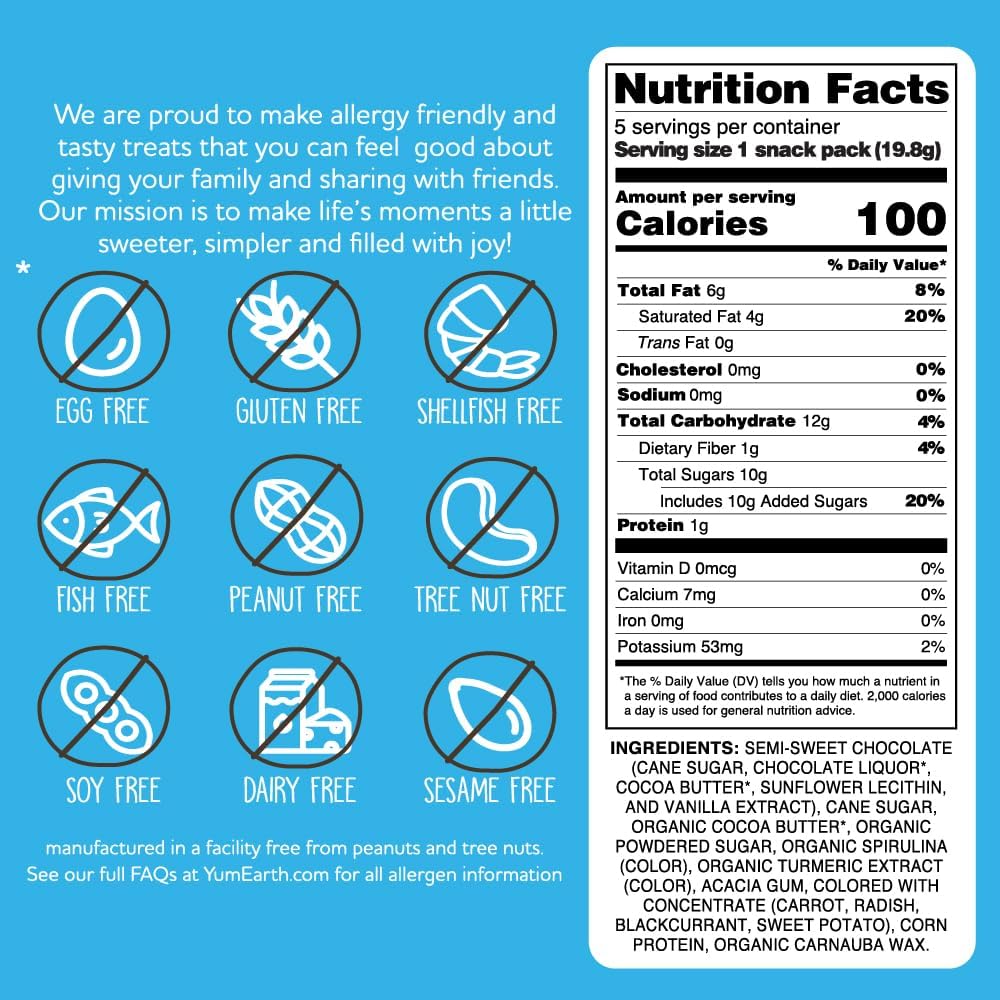 Q: How many snack packs are included in a YumEarth Choco Yums order?A: Each order of YumEarth Choco Yums includes 5 snack packs, each weighing 0.7 ounces. This makes it a perfect size for sharing or enjoying as a quick treat.