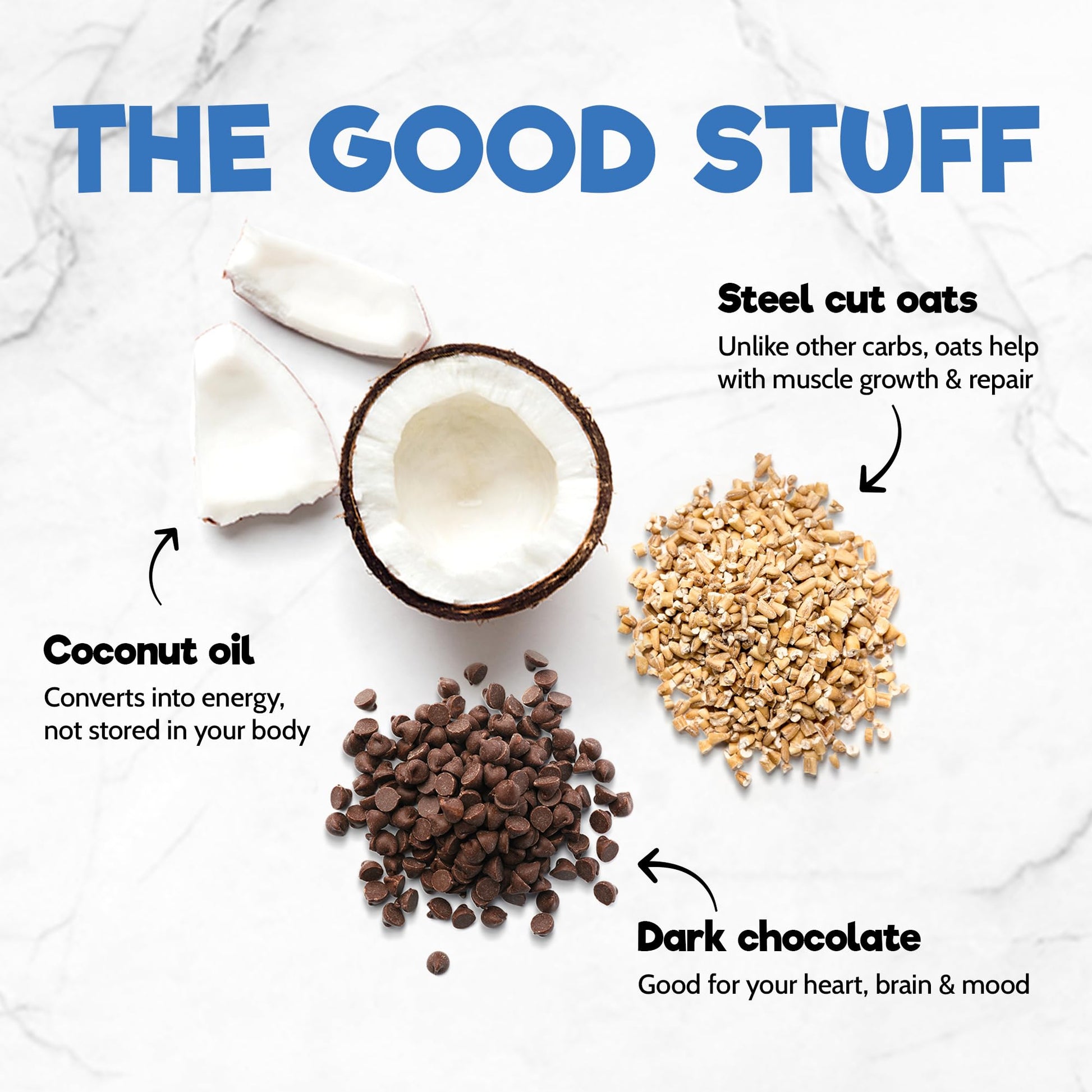 Q: What ingredients are in Doich Chocolate Chip Cookie Dough?A: Doich Chocolate Chip Cookie Dough is made with whole ingredients including dairy-free dark chocolate chips, virgin coconut oil, steel-cut oats, flaxseed, chia seeds, and pea protein.