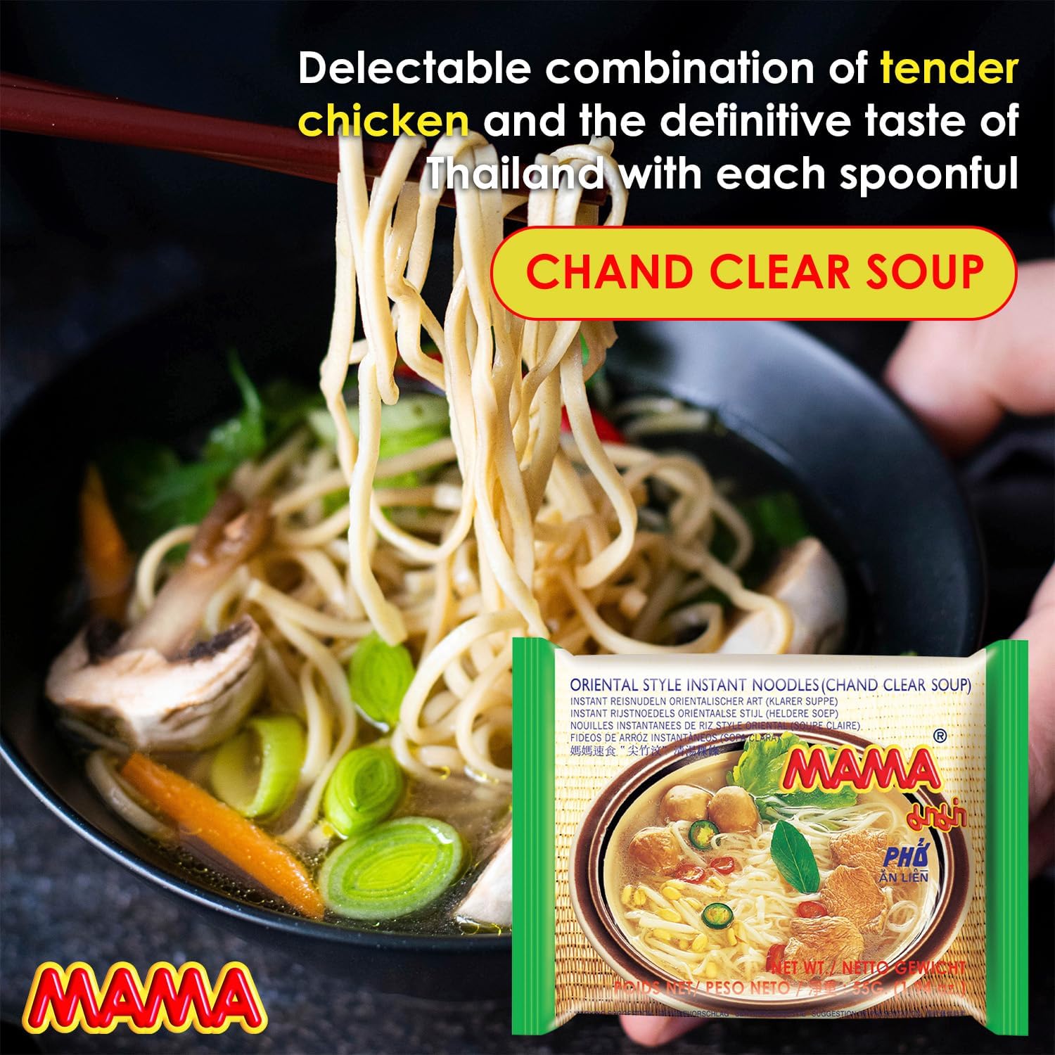Q: What flavors are included in the Mama Oriental Style instant noodles Mix Flavor Bundle?A: The Mama Oriental Style instant noodles Mix Flavor Bundle includes three delicious flavors: Pho Ga (Chicken), Pho Bo (Beef), and Pho Chand (Clear Soup), with a total of 30 packs—10 bags of each flavor.