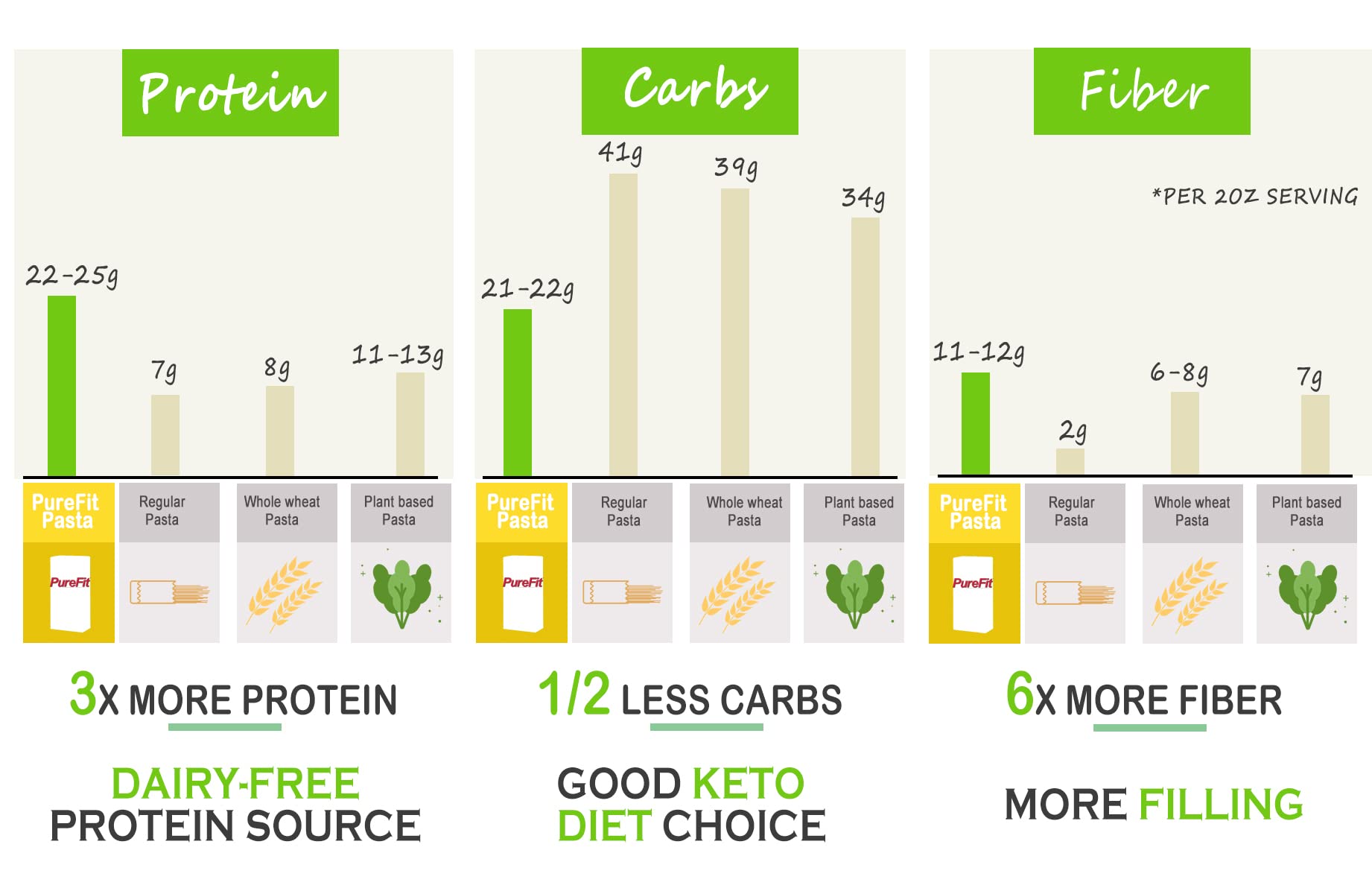 Q: What are the nutritional benefits of PureFit Organic Soy Bean Fettuccine Pasta?A: PureFit Organic Soy Bean Fettuccine Pasta is rich in plant-based protein, offering over 40 grams per 3.5 oz serving, and contains 20 grams of fiber, making it a great choice for those looking to maintain a high-protein, low-carb diet.