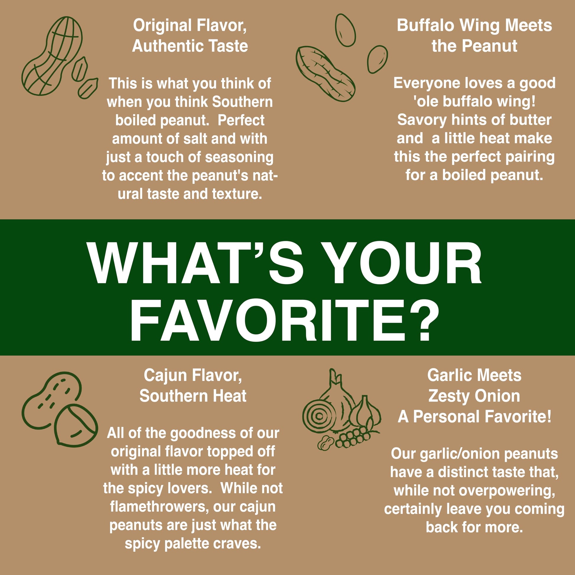 • Q: What flavors are available in the Boiled Peanuts Kit? A: The Boiled Peanuts Kit offers four delicious flavors: Original, Cajun, Garlic Onion, and Buffalo Wing. Each kit includes a seasoning pouch that enhances the peanuts' flavor as they boil.