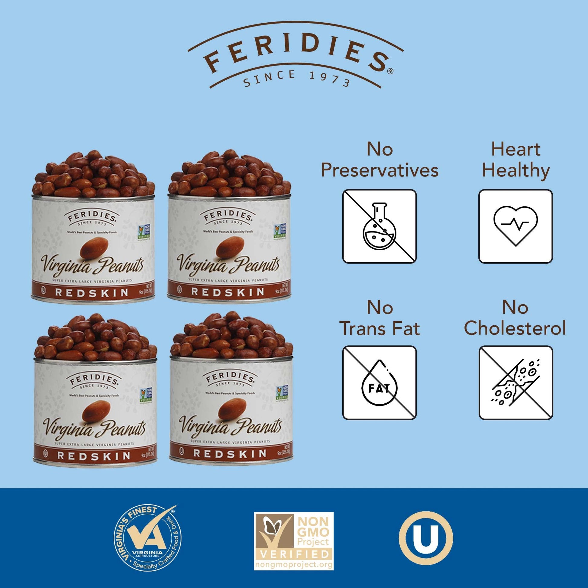 - Q: What are the main ingredients in FERIDIES Extra Large Salted Red Skin Peanuts? A: FERIDIES Extra Large Salted Red Skin Peanuts primarily contain Virginia peanuts, which are cooked in pure peanut oil and lightly salted. They do not contain preservatives, cholesterol, or trans fats.