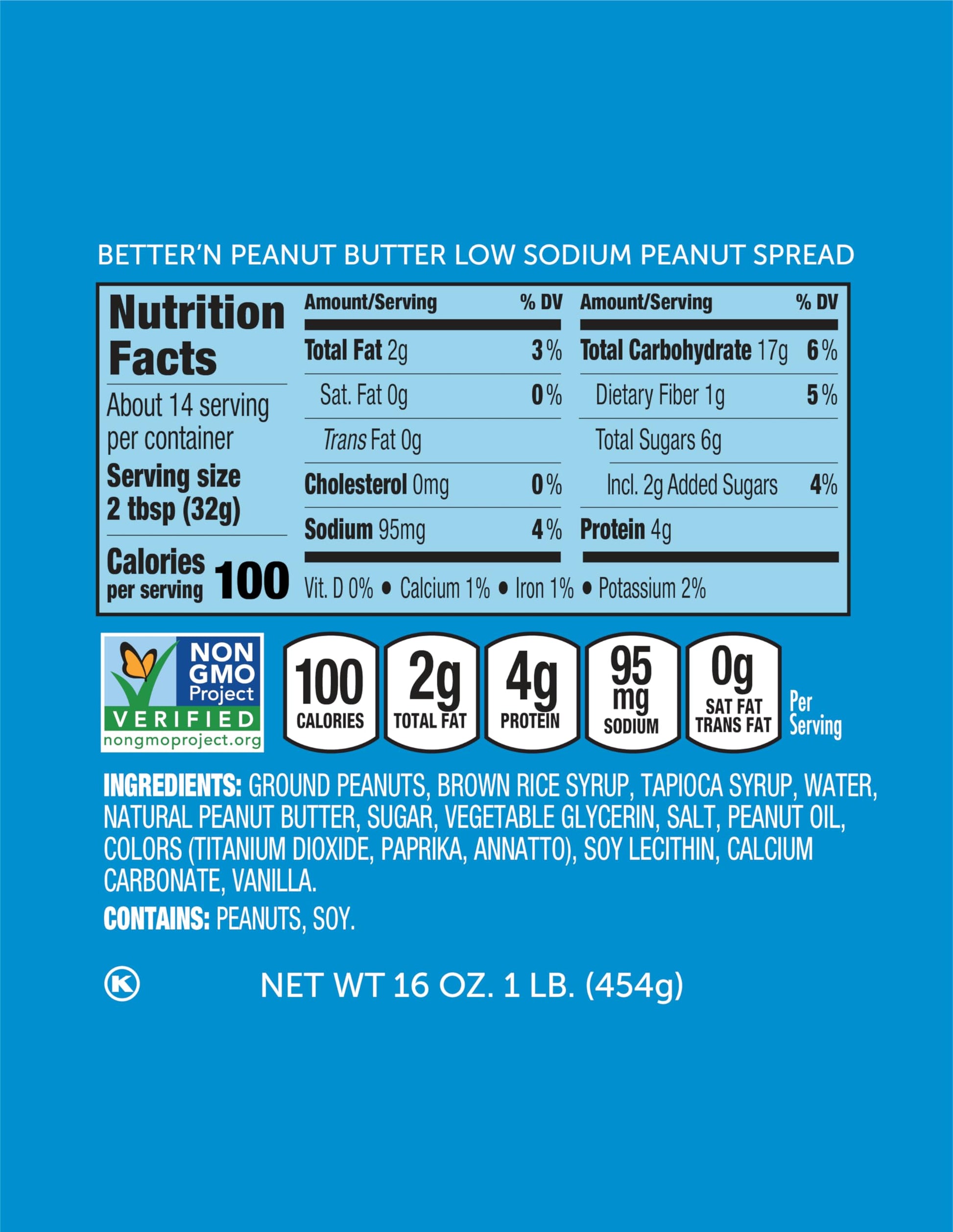 Introducing our Low-Sodium Peanut Butter, where smooth, creamy, and nutty goodness meets a commitment to your health and wellness. This is not just your ordinary peanut butter; its Bettern Peanut Butter, redefining the landscape of indulgence with a low-sodium treat that boasts only 80mg of sodium per serving. Revel in the extraordinary taste experience that goes beyond the conventional, offering everything you need for your favorite PB fix while prioritizing your well-being with an impressive 50% fewer calories and a remarkable 85% less fat than average peanut butter. At Bettern Peanut Butter, we take pride in creating a low-sodium, low-calorie, and diet-friendly peanut butter spread that transcends the ordinary - its nothing short of a delight. This meticulously crafted product provides a delectable option for those mindful of their sodium intake, ensuring a flavorful experience without compromising on health. Whether you spread it on whole grain toast, mix it into your morning oatmeal, or savor it straight from the spoon, our Low-Sodium Peanut Butter promises a burst of pure nutty goodness with every serving. Its not just peanut butter; its Bettern Peanut Butter, where the pursuit of taste meets a dedication to your health. Elevate your snacking experience with our Low-Sodium Peanut Butter, a delectable and mindful choice that proves you can have both flavor and wellness in a jar. Join us in embracing a new standard of peanut butter thats not just good; its Bettern.