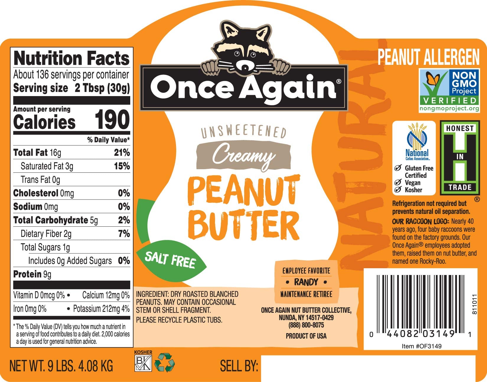 Once Again Natural, Creamy Peanut Butter, 9Lb Bucket (Same As 9 Jars) - Salt Free, Unsweetened - Gluten Free Certified, Vegan, Kosher, Non-Gmo Verified