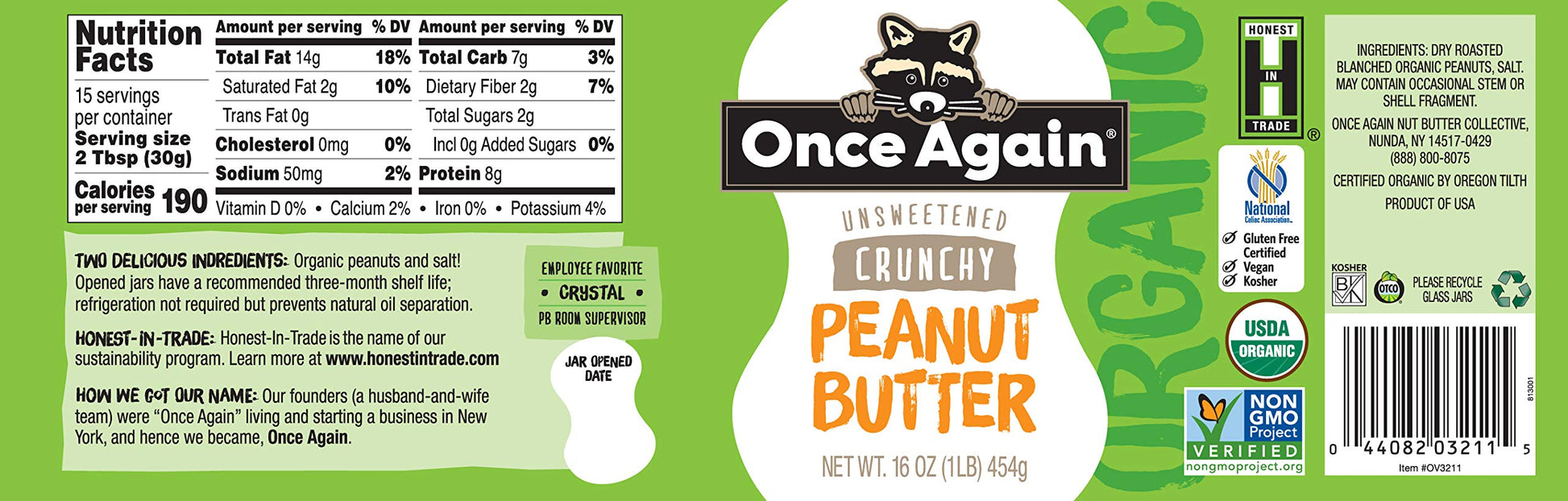 CRUNCHY PEANUT BUTTER || 16 oz deliciously crunchy, certified organic peanut butter. Our peanut butter is made by roasting and grinding blanched, dry roasted peanuts until they are wonderfully creamy. We then add our crunchies. Contains Peanuts. Produced in a Peanut-only facility | LIGHTLY SALTED, UNSWEETENED || This product contains peanuts, with a hint of salt to bring out the exquisitely roasted flavor. Unsweetened | ETHICALLY SOURCED || Our peanuts are sourced from Nicaragua, Argentina and the USA | CERTIFIED || USDA Organic, Non-GMO, Gluten free, Vegan, and Kosher Certified. No added preservatives | MINIMAL WASTE || Once Again Nut Butters are packaged in recyclable glass jars