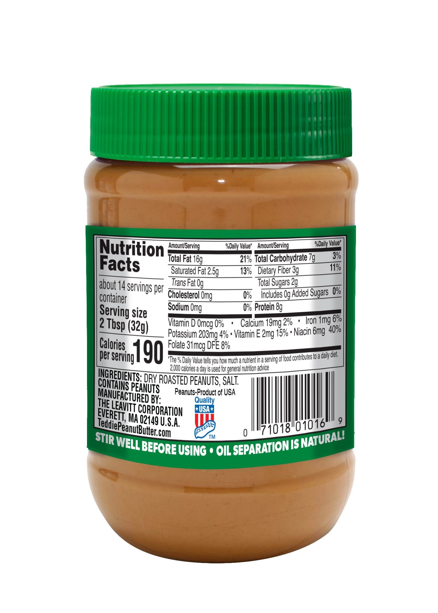 Teddie All Natural Smooth Peanut Butter is the most delicious and nutritious peanut butter available today. Made with just peanuts, it comes in SALTED and UNSALTED varieties. Whether you love your Teddie on a sandwich, in a smoothie, with dessert or by the spoonful, our family has lovingly prepared every last bite for the enjoyment of yours. Teddie All Natural Smooth Peanut Butter is available in two sizes 16 OZ and 26 OZ. The 16 OZ (1 LB) comes in a glass jar, the 26 OZ (1 LB 10 OZ) comes in a plastic jar. One more thing: Oil separation occurs naturally in our peanut butter. Although you dont need to refrigerate Teddie, to slow the oil separation just stir the jar contents, tighten the cap and then place it in the refrigerator.