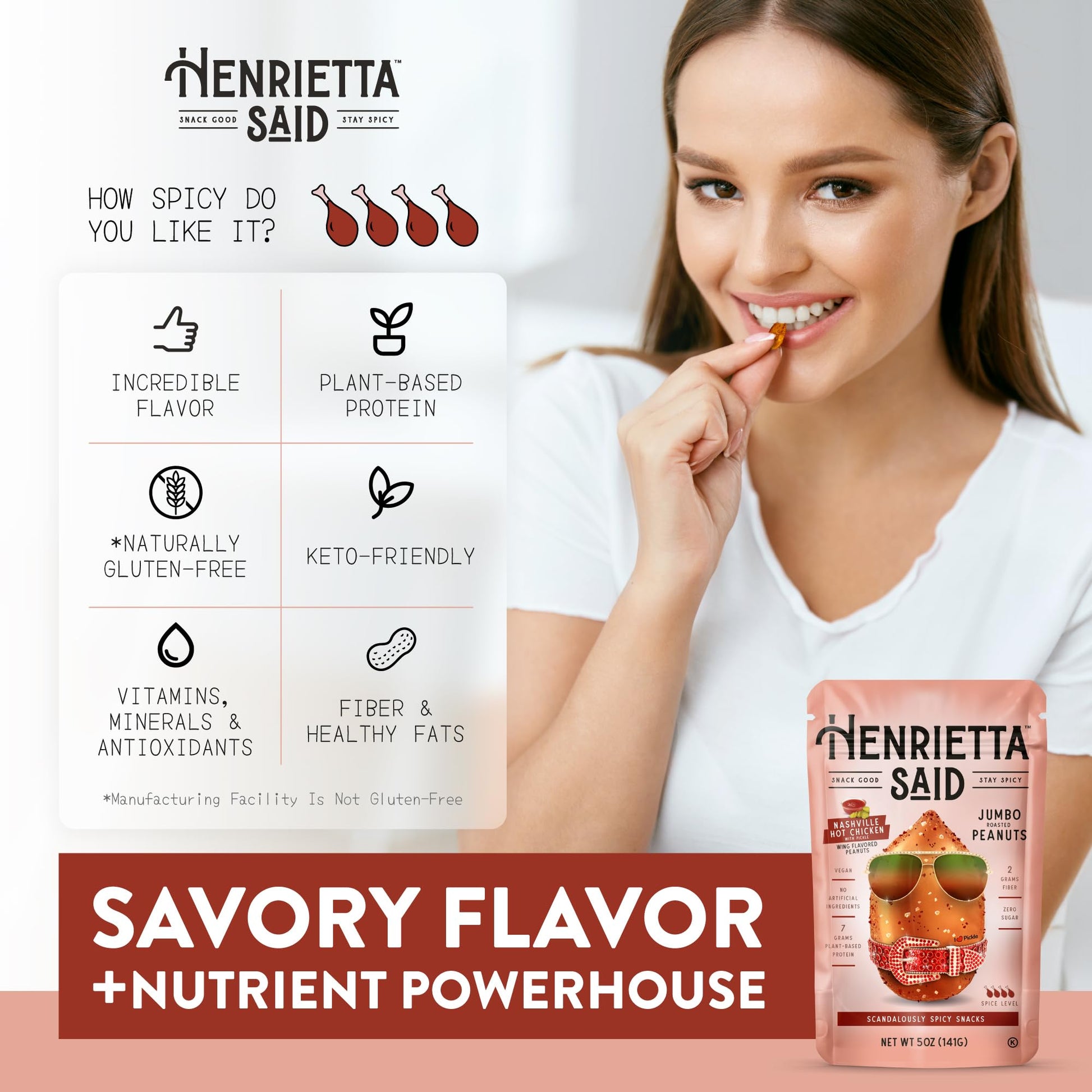 - Q: What flavors are available in the Henrietta Said Wing-Flavored Peanuts line? A: The Henrietta Said Wing-Flavored Peanuts line includes several bold flavors, including Nashville Hot Chicken With Pickle, which features a blend of spicy, buttery, and dill pickle flavors.