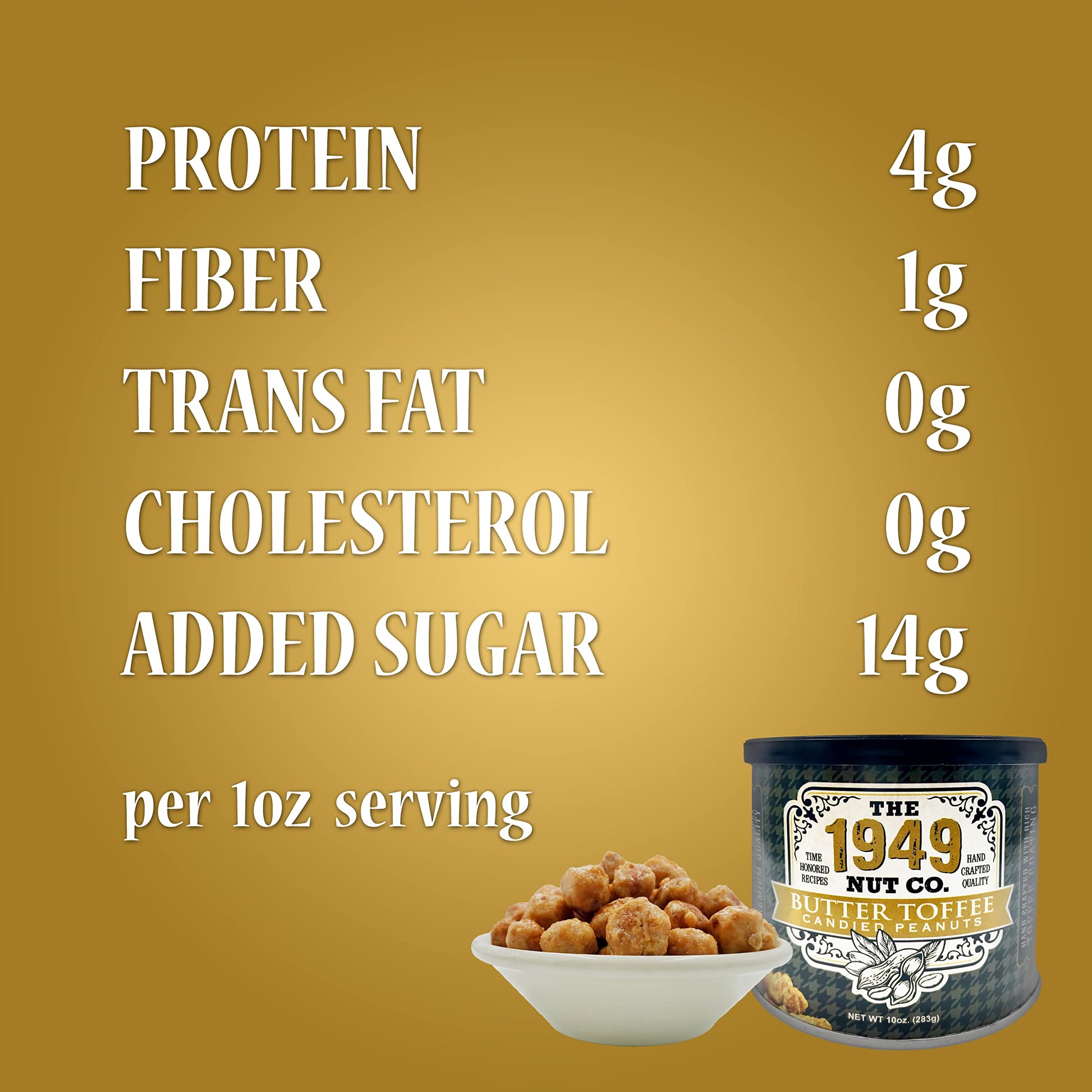 - Q: What is the nutritional information for The 1949 Nut Co. Butter Toffee Candied Peanuts? A: The peanuts are protein-rich and contain no trans fats or cholesterol, making them a healthier snack option. For specific nutritional values, refer to the product packaging.