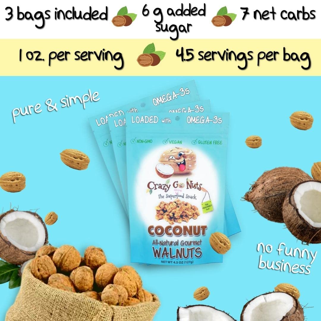 Crazy Go Nuts Walnuts - Coconut, 4.5 Oz (3-Pack) - Healthy Snacks, Vegan, Gluten Free, Superfood - Natural, Non-Gmo, Ala, Omega