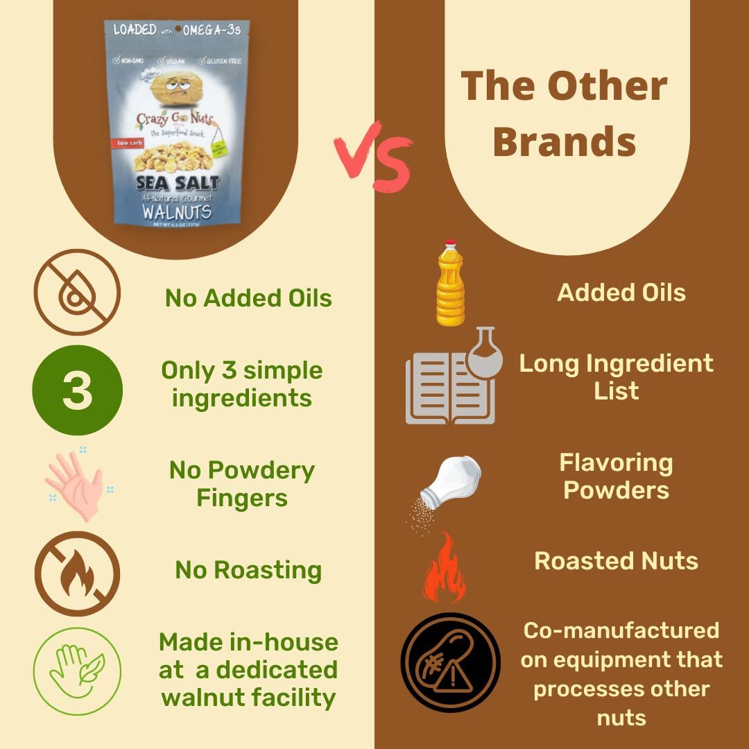 - Q: What flavors of walnut snacks does Crazy Go Nuts offer? A: Crazy Go Nuts offers a variety of delicious walnut snacks including Coconut, Buffalo, Chocolate Espresso, Banana, Garlic Parmesan, Maple, Oatmeal Cookie, Sea Salt, Sweet & Spicy, Hawaiian BBQ, and Rosemary Pink Salt, catering to different taste preferences.