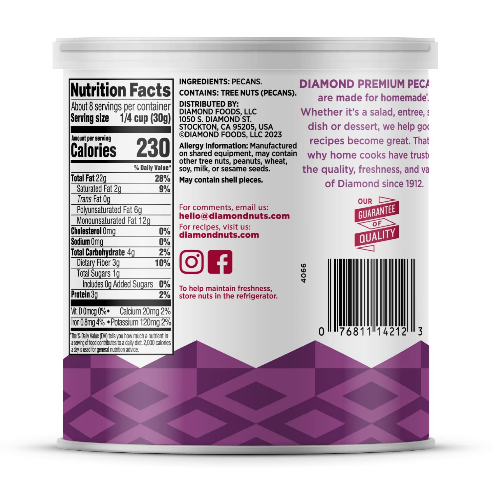 - Q: What are the nutritional benefits of Diamond of California Shelled Pecan Halves? A: Diamond of California Shelled Pecan Halves offer numerous nutritional benefits, including 3 grams of protein and 4 grams of carbs per serving. These pecans are also Non-GMO Project Verified, salt-free, and cholesterol-free, making them a healthy addition to any diet.