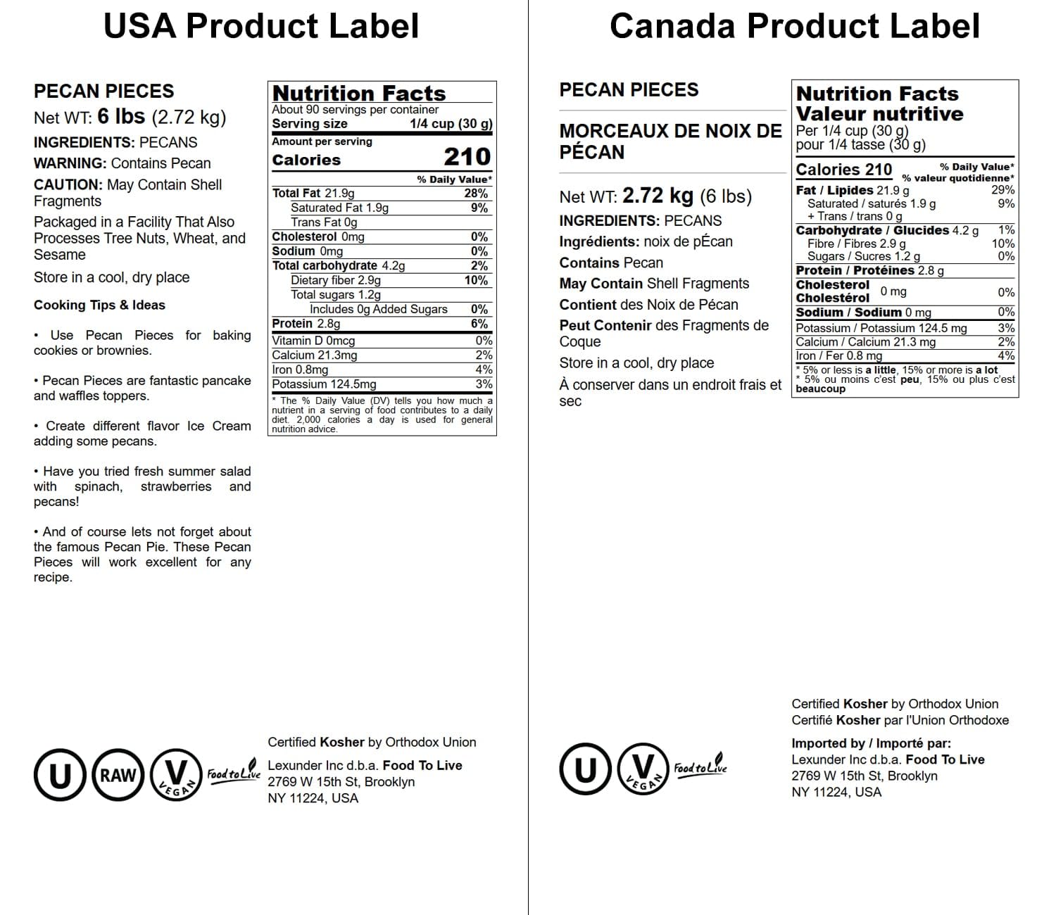 - Q: Is there any allergen information for Food to Live Pecan Pieces? A: Food to Live Pecan Pieces are unsalted, unroasted, and shelled, making them suitable for many dietary preferences. However, they are made in a facility that processes tree nuts, so those with nut allergies should exercise caution.