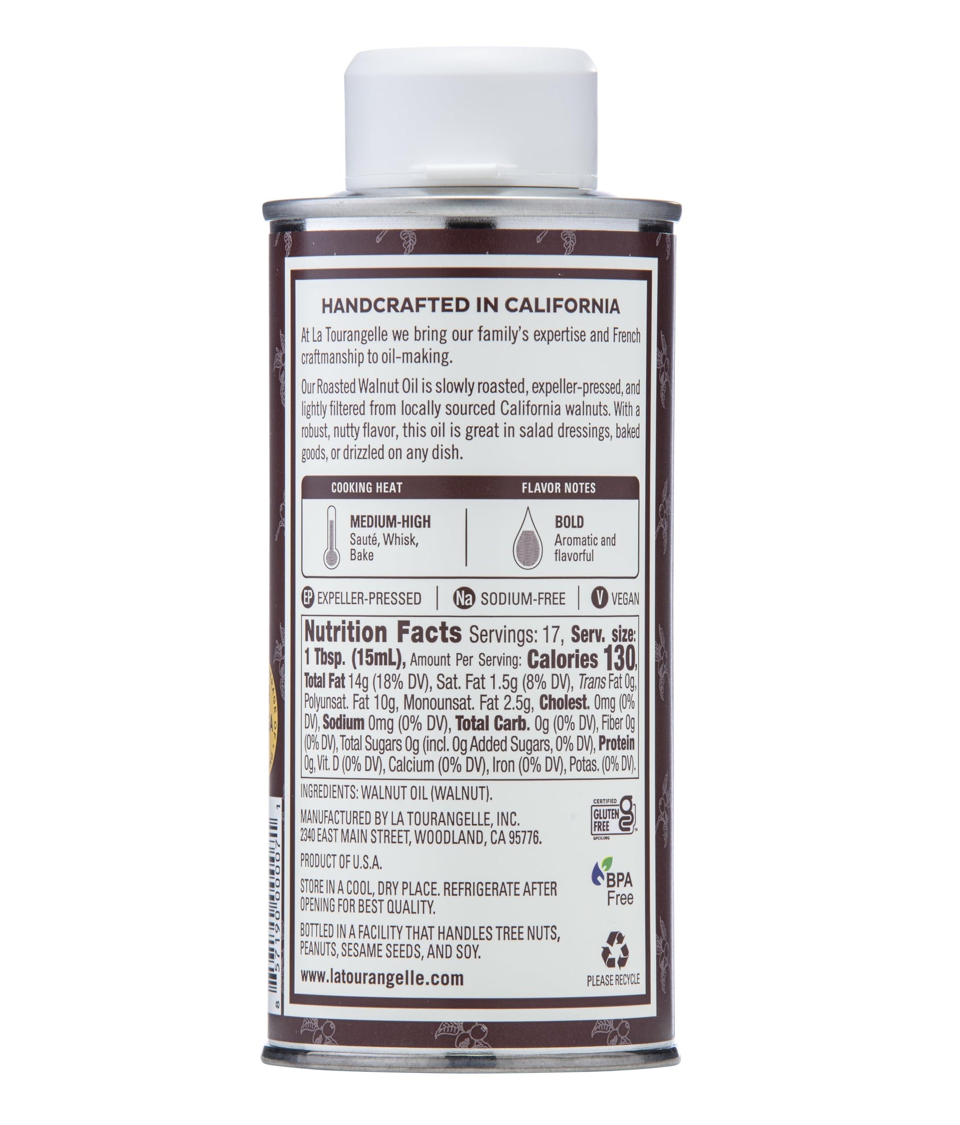 La Tourangelle Walnut Oil is pure, all-natural and handcrafted in our California Mill strictly following a 150-year-old French traditional method. First the English walnuts are ground and slowly roasted to perfection in cast-iron kettles, then expeller-pressed and lightly filtered. The result is an exceptional yellow topaz oil that will add a rich nutty flavor to all your dishes and is perfect to dip with bread and cheese. La Tourangelle Roasted Walnut Oil is a delicious and easy-to-use oil. You can pour it on everything, drizzle on your steak, topping your pasta, enhance your barbeque with it. La Tourangelle Roasted Walnut Oil is the ultimate finishing oil for beef, lamb, shrimp. As substitute to butter, it adds just enough flavors to brownies, quinoa, millet and other grains. Once you discover La Tourangelle Roasted Walnut Oil, you will return time and time to rediscover this versatile treasure. Moreover, La Tourangelle Roasted Walnut Oil is one of the healthiest oils to use for cooking. It is a rich source of heart-healthy Omega 3 fatty acid (1.23g per serving) which are usually deficient in Western diet. Omega 3 is known to help prevent cardiovascular disease while acting as a counterweight to bad cholesterol. Origin of walnut: California. Suitable for medium-high heat. Bpa-free packaging.