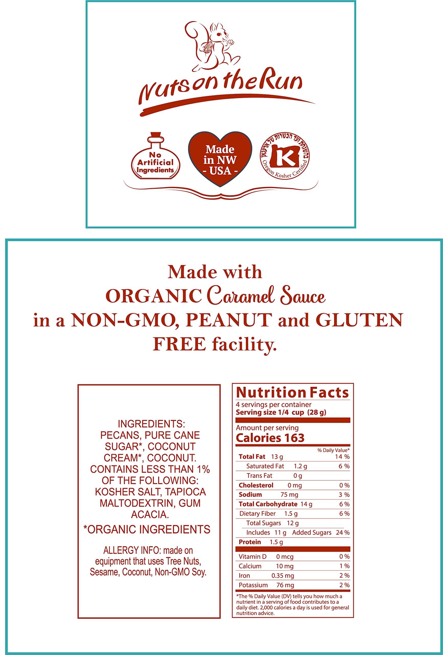 - Q: What are the main ingredients in Nuts on the Run Sea Salt Caramel Pecan Pralines? A: The main ingredients in Nuts on the Run Sea Salt Caramel Pecan Pralines include organic caramel sauce and dry-roasted pecans. They are also vegan, kosher, non-GMO, and gluten-free.