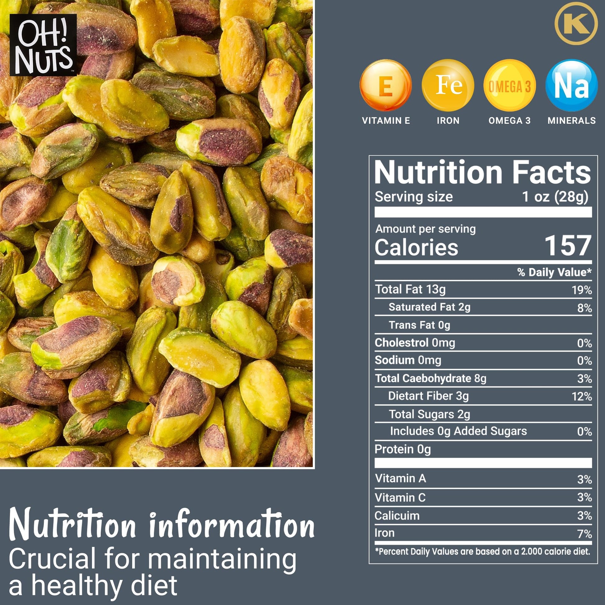 FLAVOR PACKED PISTACHIO GOODNESS: Whole Shelled Raw Pistachios are treasured for their meatier, richer taste of nuttiness; they make a healthy snack with no additives. | HEALTH PACKED PISTACHIO NUTS: Healthy Pistachios pack a protein punch, yielding almost all the essential nutrients your body needs and with a lower fat content than any other snacking nuts. | FROM FARM TO TABLE - QUALITY ENSURED: Quality pistachios bulk are selected for freshness and arrive to you fresh, tasty and packaged in a stay-fresh shelf-stable and moisture-proof party nut 16 oz sack. | BULK OPTIONS FOR THOSE PISTACHIO CRAVINGS: Variety pistachios, Oh! Nuts offers the pistachios in different ways to enable to incorporate pistachios in your baking, cooking or party planning that suits your taste. | SNACKING, BAKING, OR ADDING TO RECIPES: Great snack for those on restricted diets, Paleo, Keto, Sugar Free, Heart Healthy, Gluten Free, Vegan and always certified Kosher.