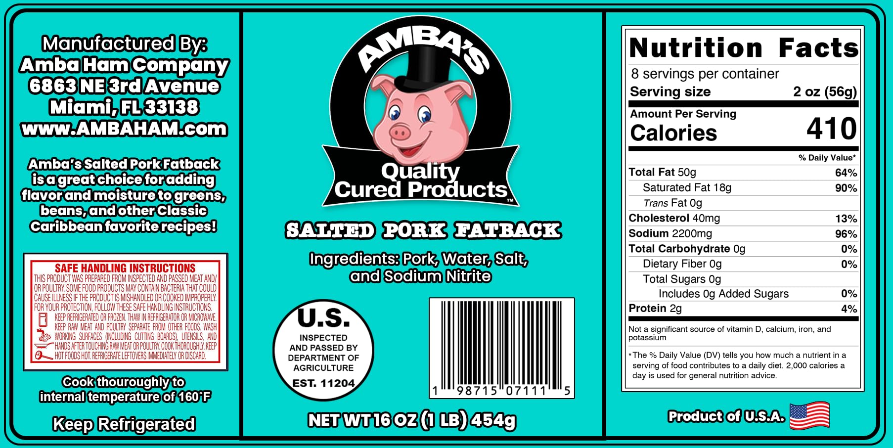 Salted Pork Fatback (Skin On), Net Wt 16oz/1lb Vacuum Pack Bags, Used For Flavoring And Seasoning In Traditional Southern Cuisine And Caribbean Recipes. Tocino De Cerdo Salado Con Pellejo Para Usar Como Saborizante Y Sazonar En Recetas Caribeas Tradicionales. This Product Contains Pork Fatback Skin On (Net Wt 16oz/1lb) Cured with a Solution of Water, Salt, and Sodium Nitrite. This Product is Made in the U.S.A. and is U.S.D.A. Inspected for Quality Assurance. Please Adhere to the Safe Handling Instructions for Raw Products. This Product was Prepared from Inspected and Passed Meat and/or Poultry. Some Food Products May Contain Bacteria that Could Cause Ilness if the Product is Mishandled or Cooked Improperly. For Your Protection, Follow These Safe Handling Instructions. Keep Raw Meat and Poultry Separate From Other Foods. Wash Working Surfaces (Including Cutting Boards), Utensils, and Hands After Touching Raw Meat and Poultry. Cook Thoroughly. Keep Hot Foods Hot. Refrigerate Leftovers Immediately or Discard. Refrigerate After Opening. This Is a Raw Product And Must Be Cooked Thoroughly To Internal Temperature Of 160 F For Consumption. El Art culo Es Un Producto De Cerdo Crudo Y Debe Cocinarse Completamente A La Temperatura De 160F Internal Para Su Consumo.