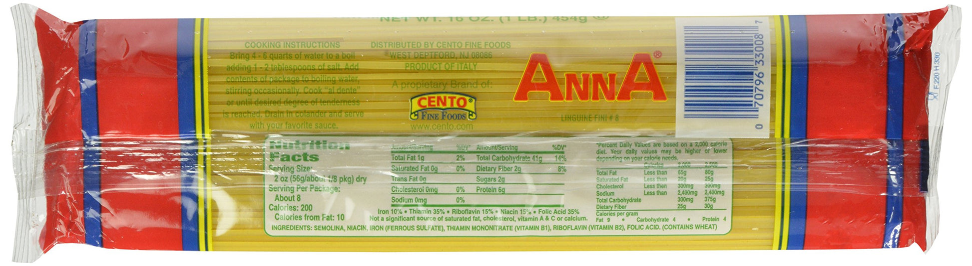- Q: What is the nutritional information for Anna Linguine Fini Pasta? A: Each serving of Anna Linguine Fini Pasta contains approximately 200 calories, with a good source of carbohydrates and protein. For specific nutritional details, refer to the packaging or the manufacturer's website.
