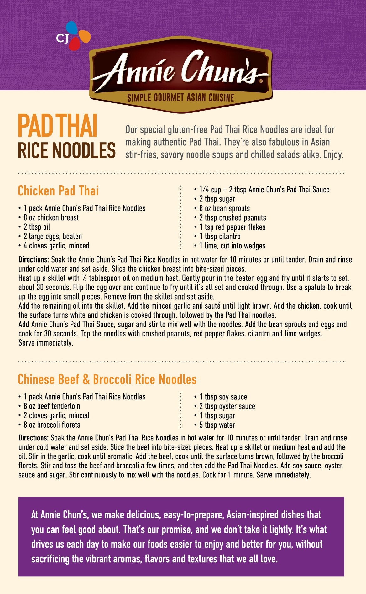 Our Pad Thai (Fettuccine) Rice Noodles Are Perfect For Making Thailand'S National Dish, Pad Thai, Right At Home. Like All Our Rice Noodles, They Are Fat Free Food, Free Of Wheat, And Gluten. Their Delightful Texture And Mild Flavor Make Them A Fun Alternative To Ordinary Pasta. Bring Home Annie Chuns Pad Thai Rice Noodles Today To Add Some Traditional Thai Flavors To Your Meal.