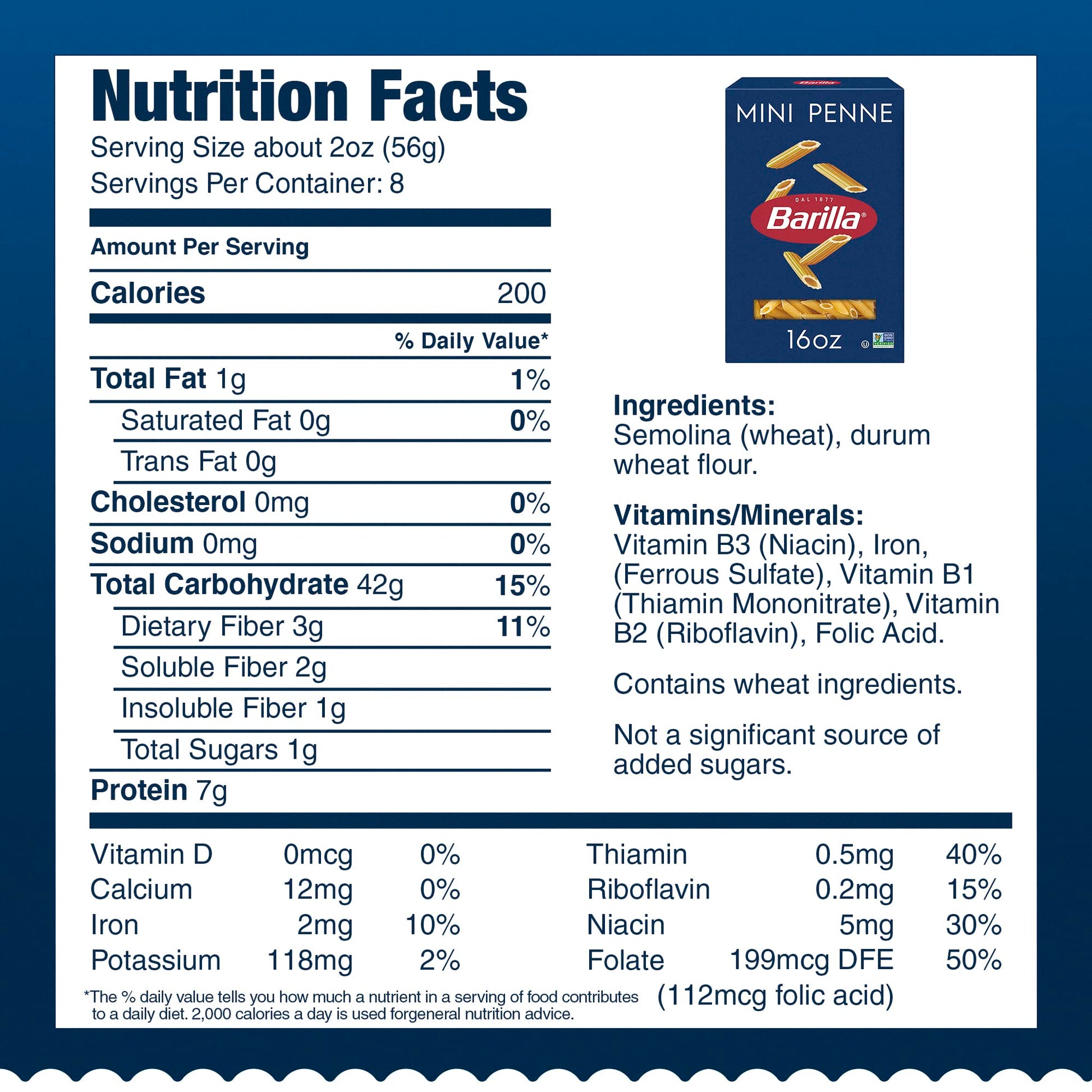 Q: What are the main ingredients in Barilla Mini Penne Pasta?A: Barilla Mini Penne Pasta is made from 100% durum wheat semolina and water, ensuring a great taste and perfect 'al dente' texture. It is also made with non-GMO ingredients, making it a healthy choice for pasta lovers.