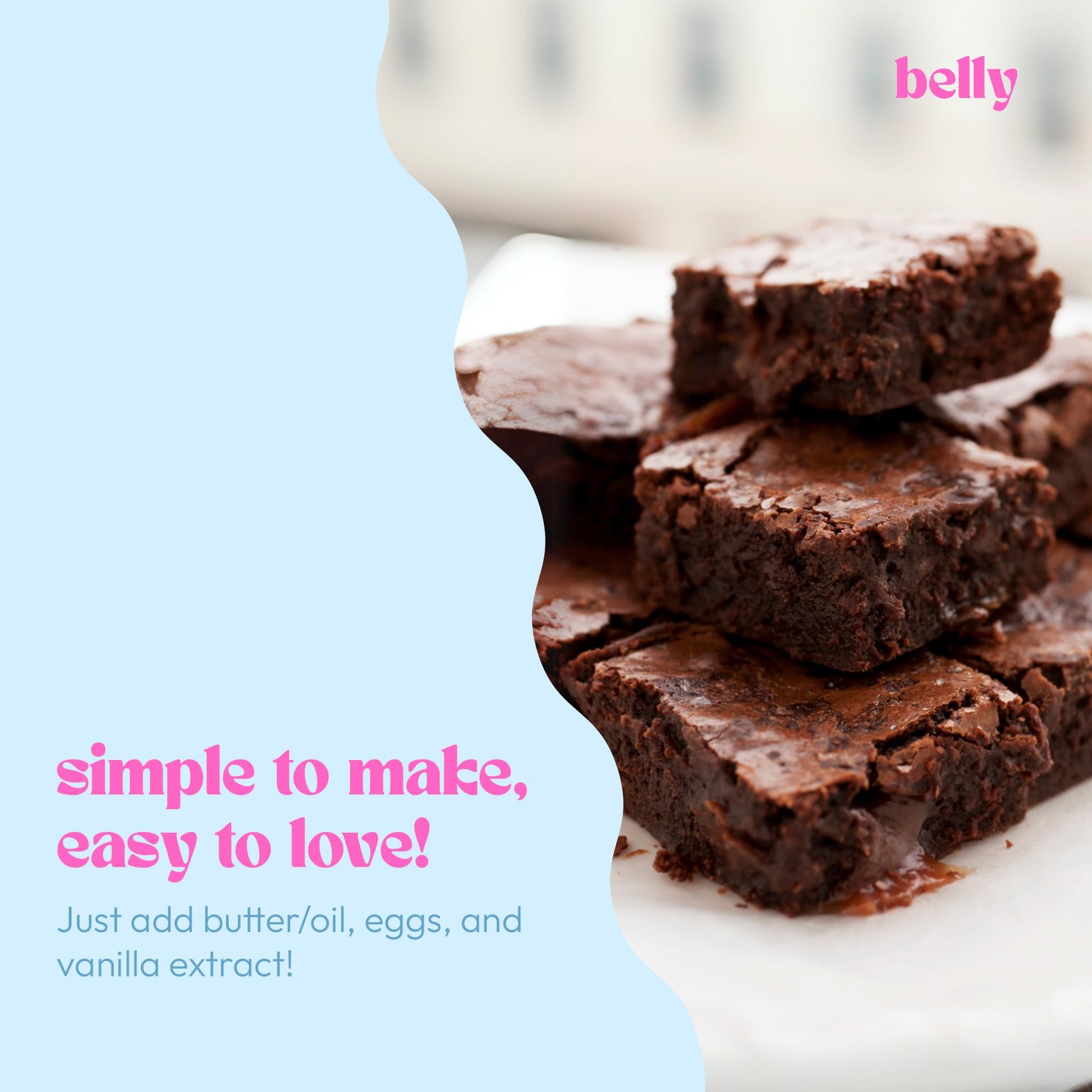 - Q: What is the texture of brownies made with this mix? A: Brownies made with Belly Brownie Mix have a chewy texture on the inside with a slightly crisp exterior, thanks to the use of cassava flour, which helps achieve a satisfying traditional brownie experience.