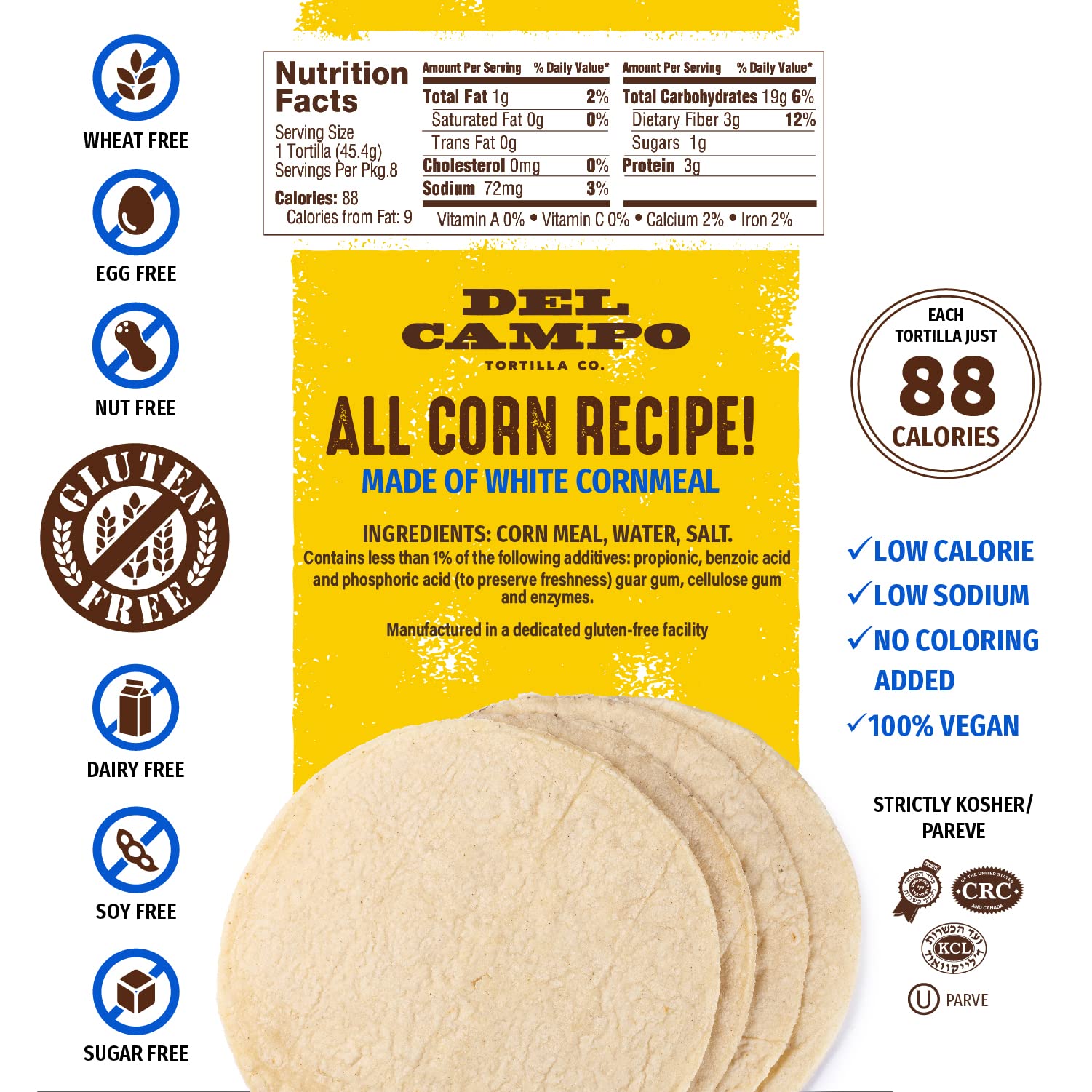 - Q: What are Del Campo Soft Corn Tortillas made from? A: Del Campo Soft Corn Tortillas are made using an authentic all-corn recipe from Mexico, ensuring a gluten-free and delicious product.