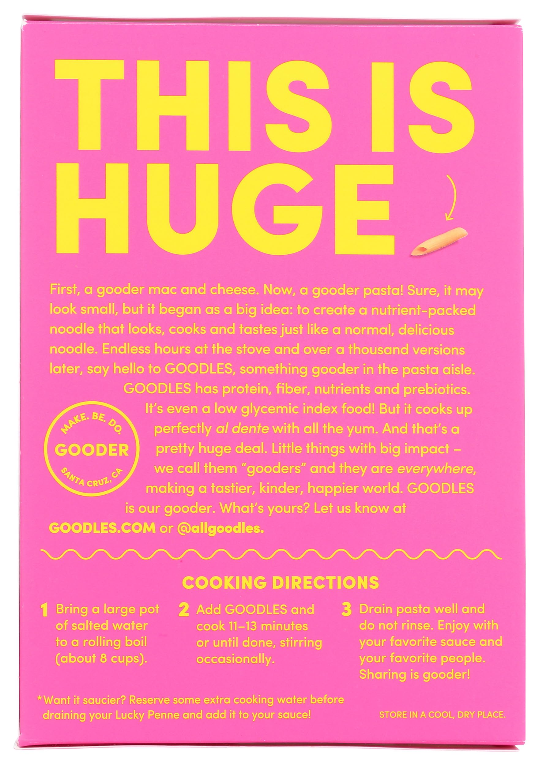 - Q: What are the key ingredients in Goodles Lucky Penne Pasta? A: Goodles Lucky Penne Pasta is made with nutrient-packed ingredients, ensuring a delicious and healthy meal option. It contains no hydrogenated fats or high fructose corn syrup, making it a wholesome choice for pasta lovers.