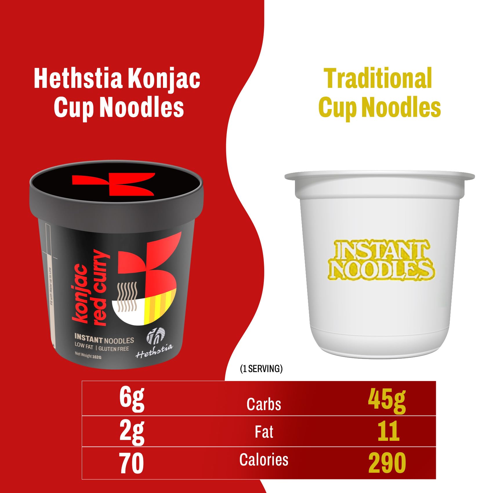 - Q: What are the main ingredients in Hethstia Konjac Noodles Red Curry Soup Cups? A: The main ingredients in Hethstia Konjac Noodles Red Curry Soup Cups include konjac noodles, a spicy red curry broth, and various natural, gluten-free components. The product is specifically designed to be low in carbs and sugar.