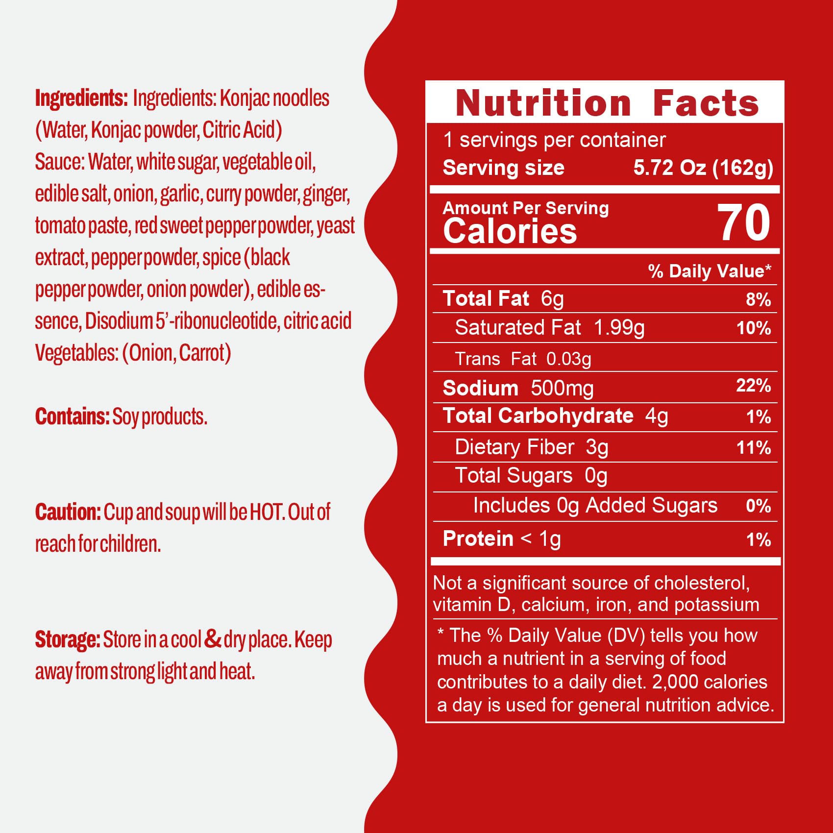 - Q: Can I follow a keto diet while consuming this product? A: Yes, Hethstia Konjac Noodles Red Curry Soup Cups are keto-friendly due to their low carbohydrate content and use of natural ingredients, making them a suitable option for those on a ketogenic diet.