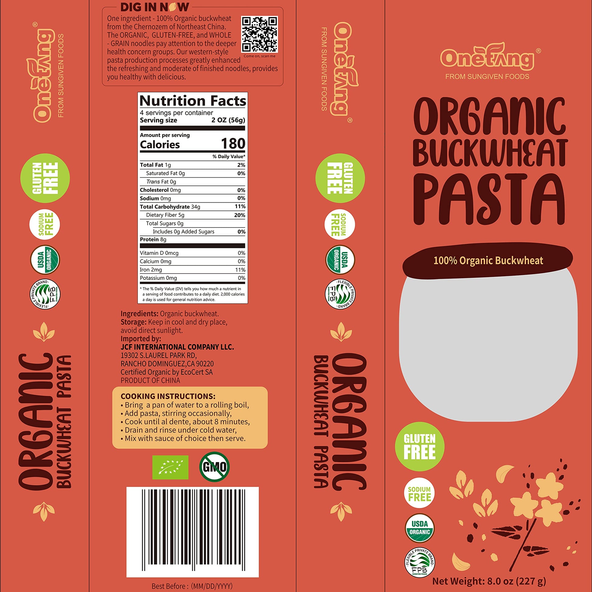 Q: What are the main ingredients in ONETANG Spaghetti Gluten-Free Noodles?A: The main ingredients in ONETANG Spaghetti Gluten-Free Noodles are organic buckwheat and fresh mountain spring water, with no added salts or artificial ingredients.