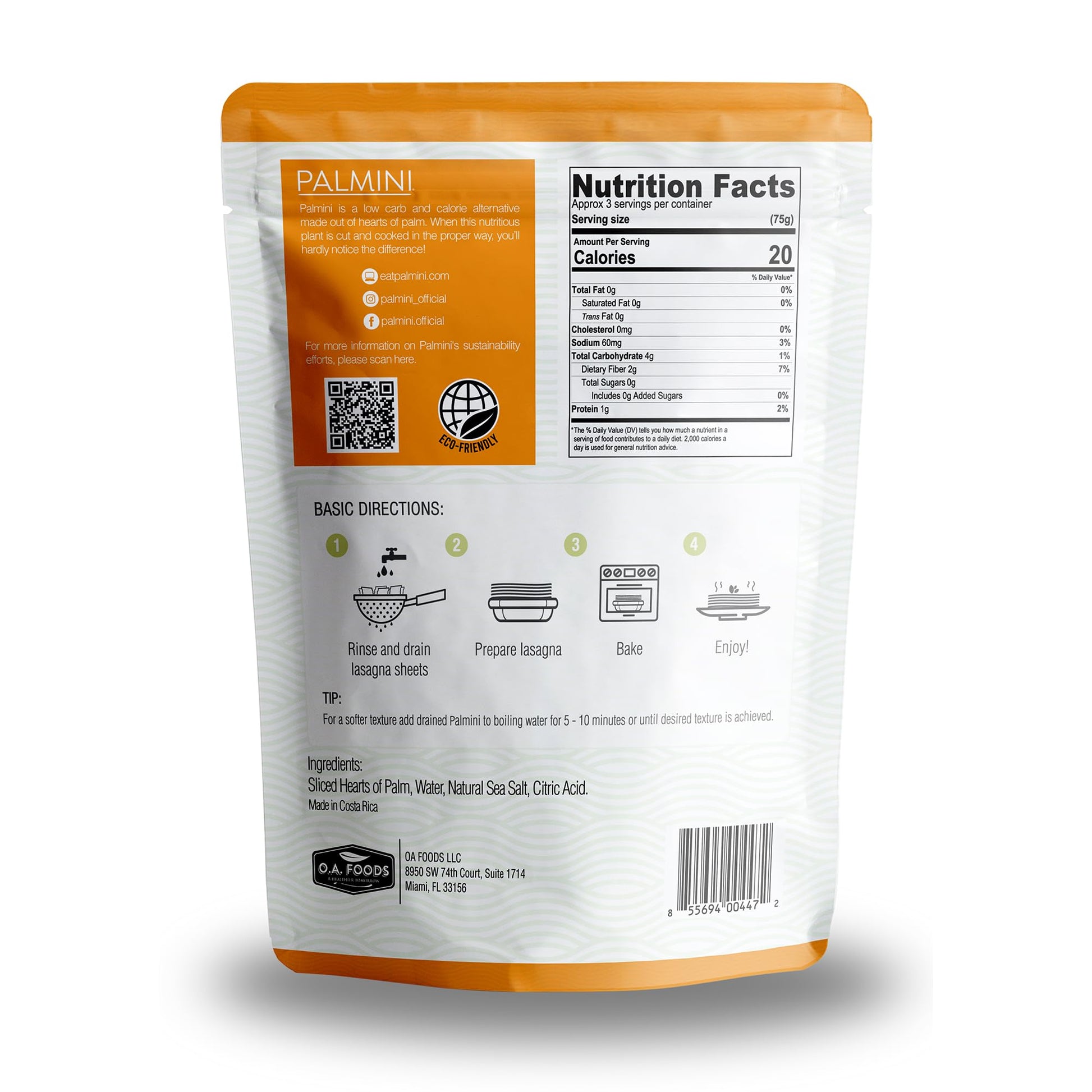 - Q: What are the main ingredients in Palmini Lasagna Sheets? A: Palmini Lasagna Sheets are primarily made from hearts of palm, which makes them a low-carb, low-calorie alternative to traditional lasagna sheets.