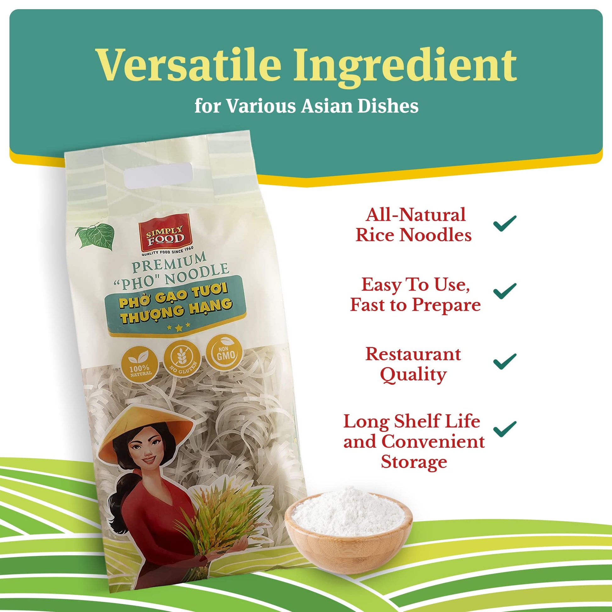 Q: What are the main ingredients in Simply Food’s Premium Pho Style Rice Stick Noodles?A: Simply Food’s Premium Pho Style Rice Stick Noodles are made from high-quality rice flour, salt, and water, ensuring they are gluten-free and non-GMO.