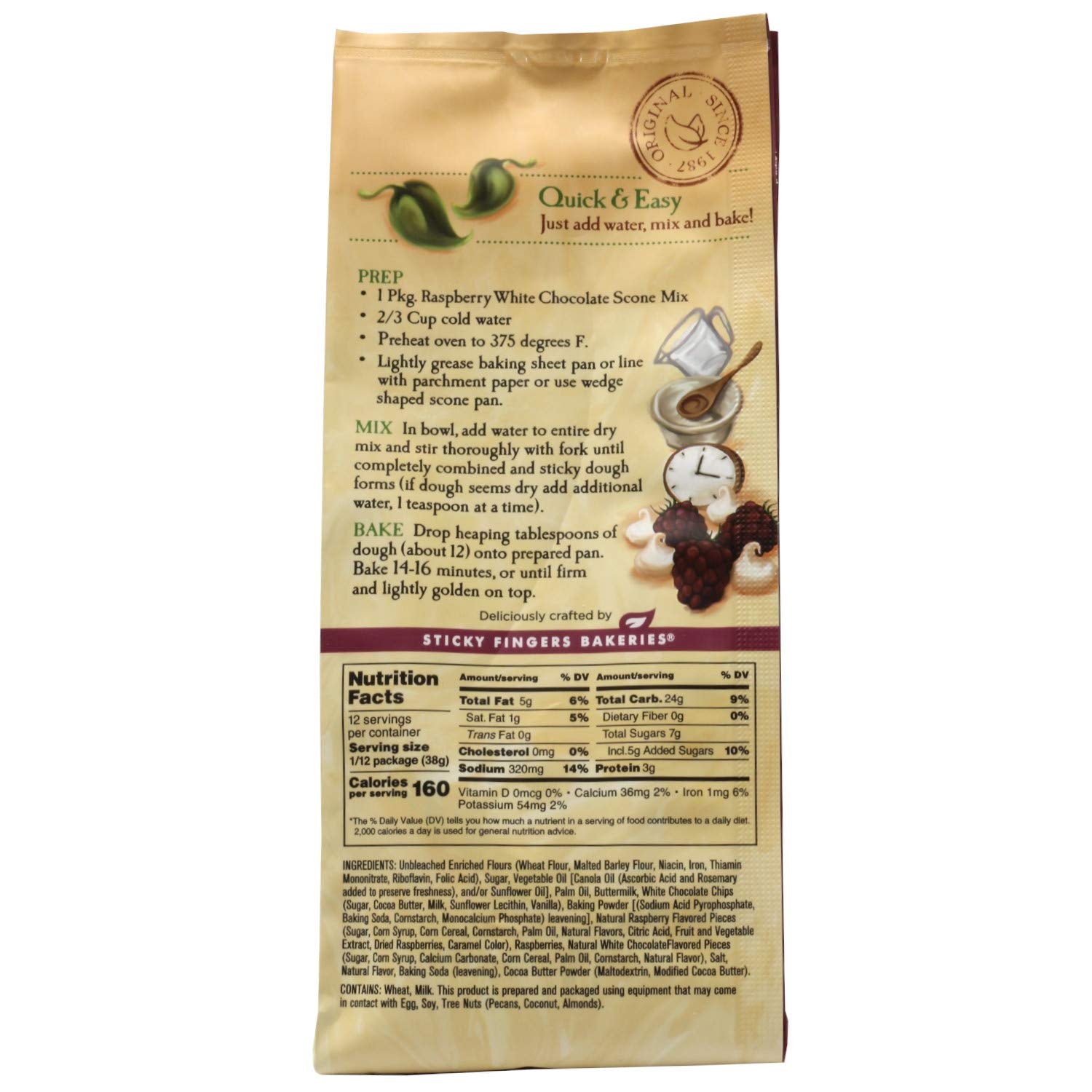 - Q: What flavors are included in the Sticky Fingers Scone Mix? A: The Sticky Fingers English Scone Mix features a delightful combination of raspberry and white chocolate, providing a sweet and tart flavor profile that enhances the scone experience.