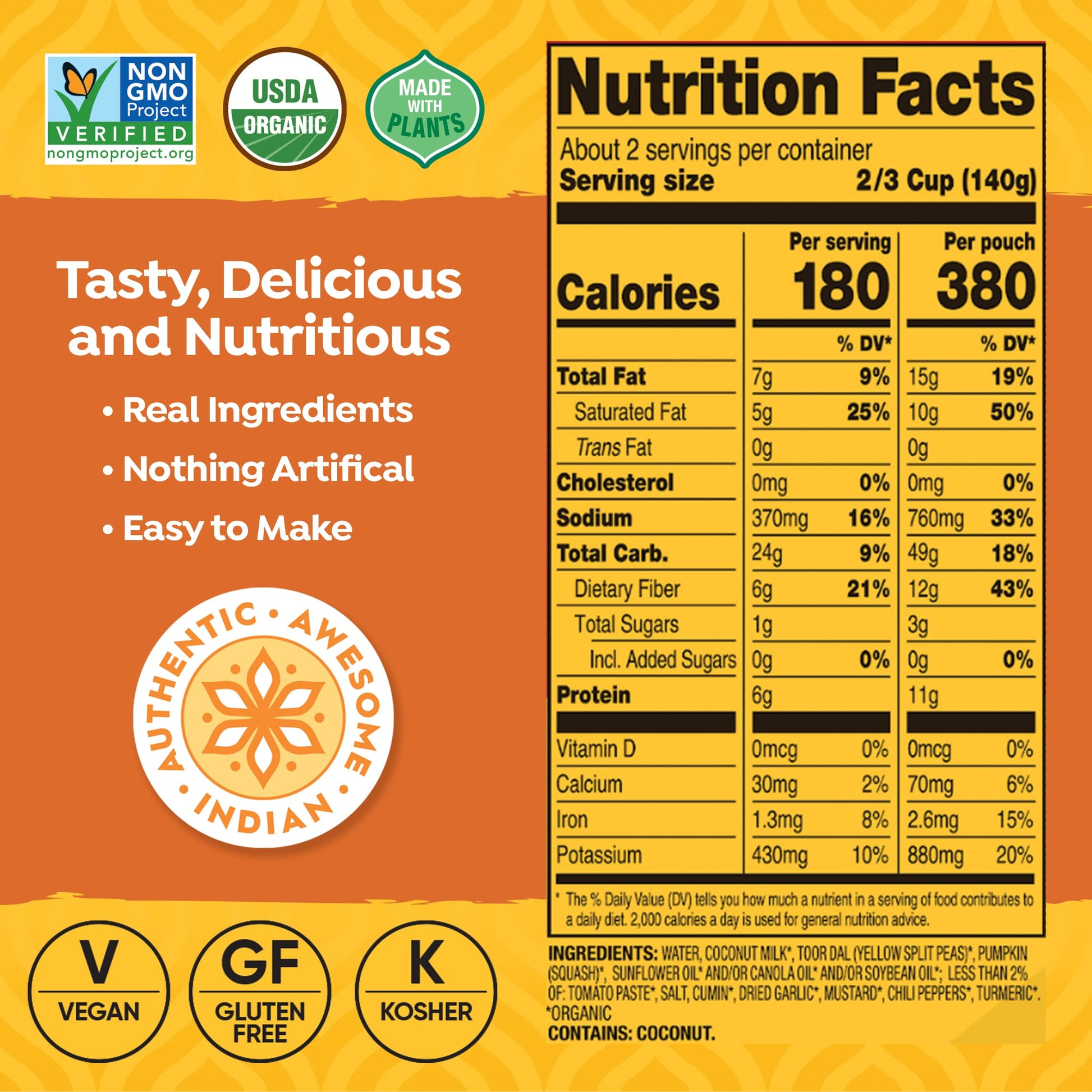 Q: What is Tasty Bite Organic Coconut Squash Dal made of?A: Tasty Bite Organic Coconut Squash Dal is made from delicious yellow dal combined with squash and spices, all immersed in a creamy coconut sauce. It uses all-natural, plant-based ingredients and is non-GMO and vegan.