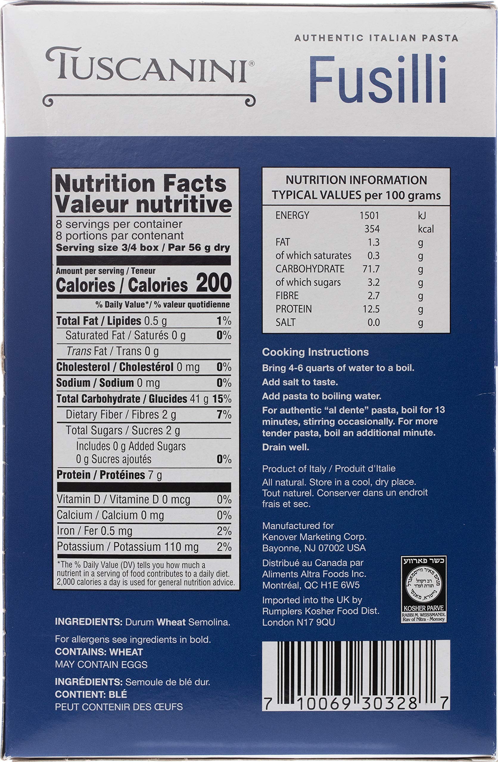 - Q: How can I cook Tuscanini Fusilli Pasta? A: To cook Tuscanini Fusilli Pasta, bring water to a boil, add the pasta, and cook for about thirteen minutes or until al dente, following the simple cooking instructions on the package.