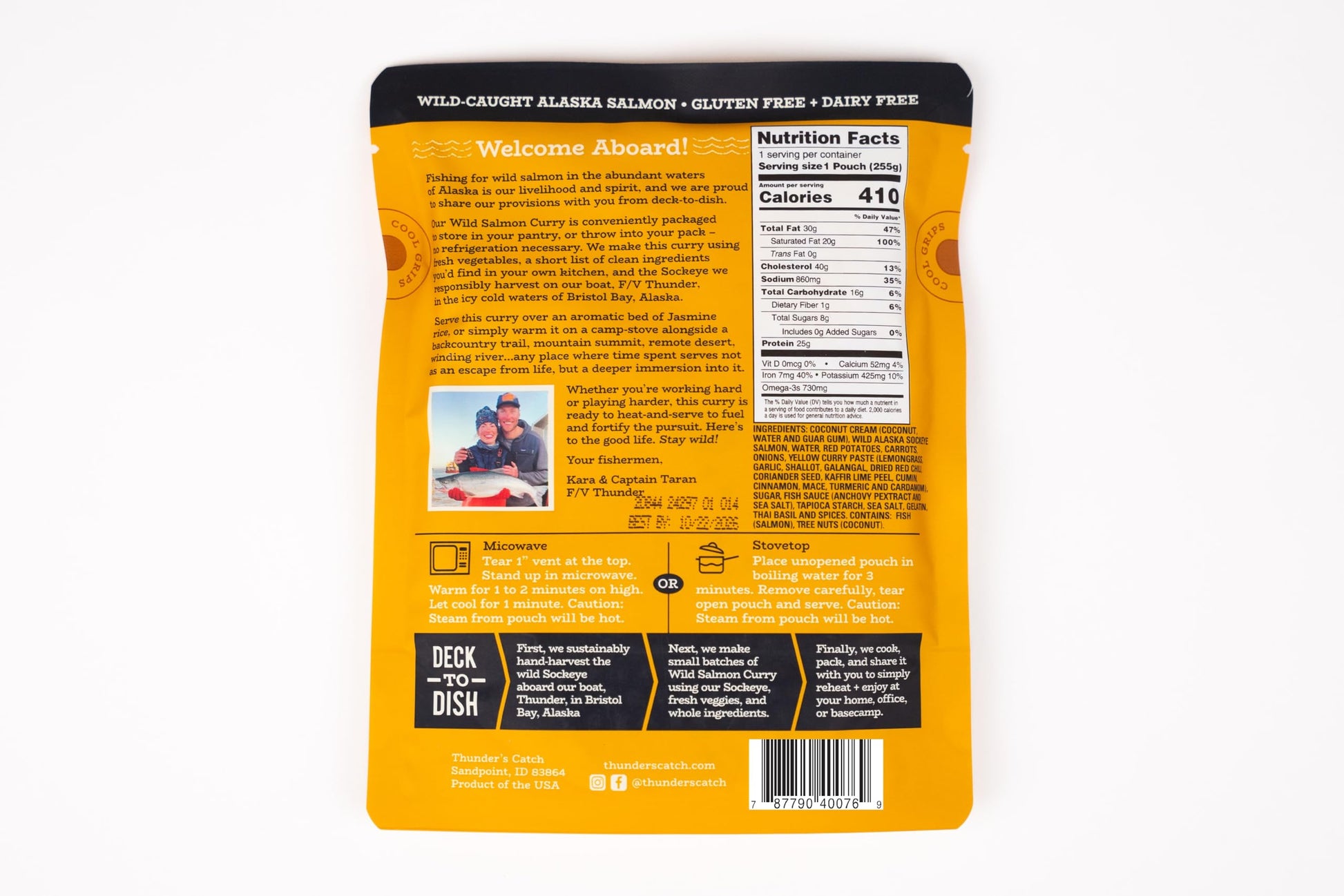 Wild Alaska Sockeye Salmon in a rich, yellow curry and coconut milk broth with potatoes and carrots. These 9 oz sustainable pouches require no need for refrigeration and have a two year shelf life (still preservative free)! Convenient and delicious. Just warm on your stovetop for 5 minutes or 1 minute in the microwave to enjoy a healthy meal - whether youre at your table at home, or in your tent at basecamp. This Wild Salmon Curry was prepared by hand with fresh, quality ingredients and our wild caught Alaska Sockeye salmon - sustainably harvested aboard our boat, F/V Thunder, in the icy waters of Bristol Bay, Alaska.