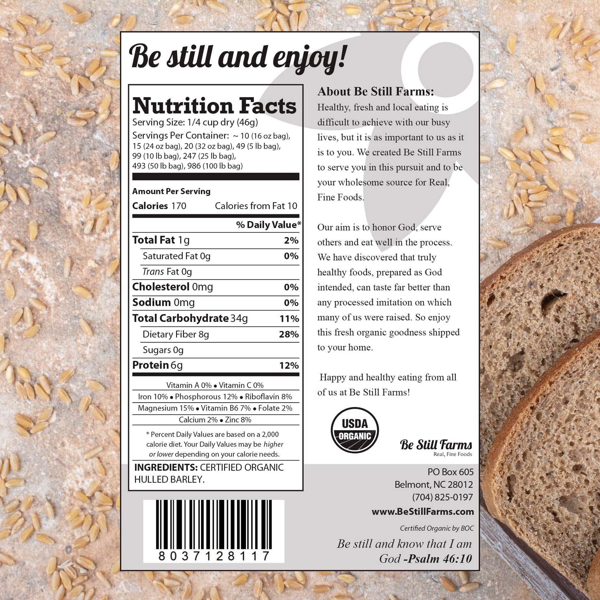 You Receive1 Bag Of Be Still Farms Organic Hulled Barley (2.8 Pounds). Our Pure Hulled Barley Berries Are Certified Usda Organic, Non-Gmo, Vegan, Vegetarian, And 100% Whole Grain. We Are Proud To Serve Only The Highest Quality Ingredients From Our Independent, Family-Owned Business In North Carolina