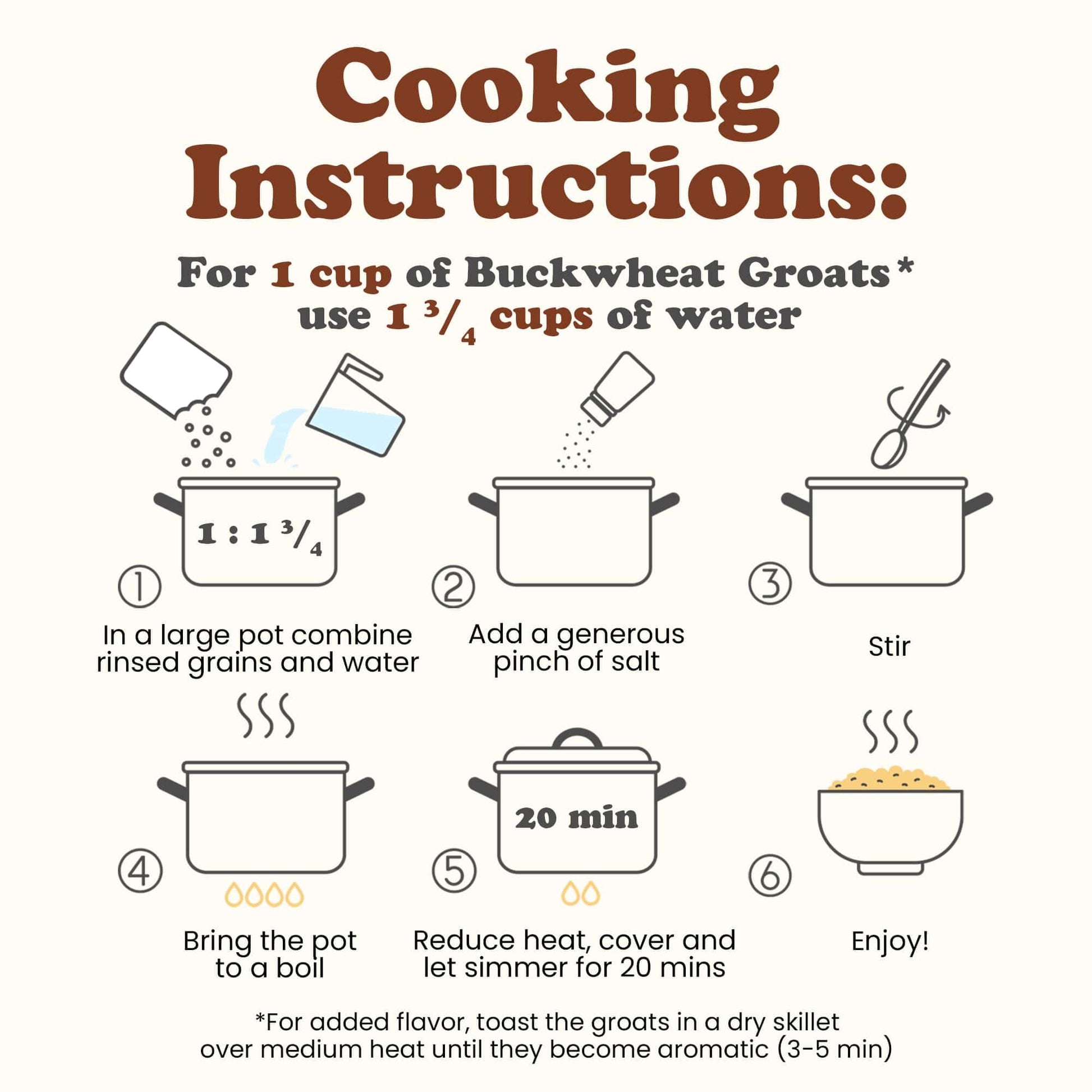 - Q: How do I cook Organic Buckwheat Groats? A: Cooking Organic Buckwheat Groats is quick and easy. Rinse the groats under cold water, then use a ratio of 1 cup of groats to 2 cups of water or broth. Bring to a boil, then reduce heat and simmer for about 10-15 minutes until tender.