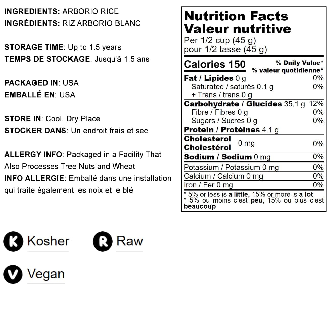 White Arborio Rice Is A Variety Of Short-Grain Rice Named After The Italian City It Originated From. What Is White Arborio Rice Known For This Kind Of Rice Has A Higher Starch Content Compared To Other Rice Varieties. Food To Lives White Arborio Rice Is Of Premium Quality, Vegan, Kosher, 100% Raw, And Available In Bulk Sizes. White Arborio Rice Benefits Just Like Other Rice Varieties, Arborio White Rice Can Be A Part Of A Balanced Diet. To Begin With, It Is A Source Of Complex Carbohydrates Which Are Our Main Fuel. Second, White Arborio Rice Contains Dietary Fiber And Plant Protein, Two Essential Macronutrients. Moreover, Arborio Rice Provides Decent Amounts Of Vitamins B1, B3 As Well As Various Essential Minerals Including Phosphorus, Magnesium, And Iron While Being Low In Fat And Sodium-Free. The Ideas On How To Use Arborio White Rice The Taste Of White Arborio Rice Is Rather Neutral Being A Perfect Base For Various Herbs And Spices While Its Texture Is Super Creamy. The Most Famous White Arborio Rice Recipe Is, Of Course, Traditional Italian Risotto. Besides, This Rice Is Excellent For Arancini - Italian Rice Balls. Furthermore, White Arborio Rice Can Be Used To Make Paella, Puddings, Stuffed Bell Peppers, Pilafs, Stir-Fries, Or Arborio Rice And White Bean Soup. If You Ask Is Arborio Rice The Same As White Rice And Can Arborio Rice Be Substituted For White Rice Arborio Rice Is A Type Of White Rice And Can Be Used In Almost Any Recipe That Calls For White Rice Or Simply As A Side, Though The Texture Of Your Meal May Be A Bit Different. How To Cook White Arborio Rice Follow Our Easy White Arborio Rice Cooking Instructions: Boil 2 Cups Of Water In A Pot Add 1 Cup Of Thoroughly Rinsed White Arborio Rice And A Pinch Of Salt Lower The Heat And Cover With A Lid Cook For 20 Minutes Enjoy! Storage Tips Does White Arborio Rice Go Bad Yes, It Does, And It Is Especially Important To Store White Arborio Rice Bulk Properly. Store It In A Moisture-Proof