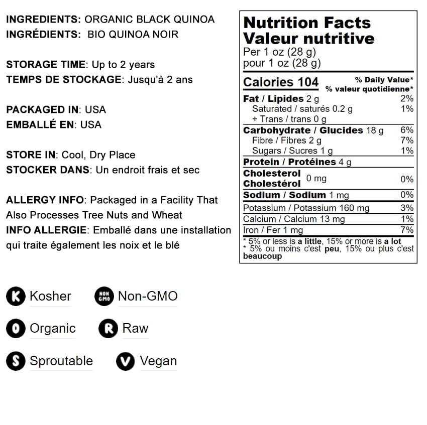 Q: Is Organic Black Quinoa non-GMO and vegan?A: Yes, Food to Live Organic Black Quinoa is certified Non-GMO and suitable for a vegan diet, making it a perfect choice for those looking for plant-based protein options.
