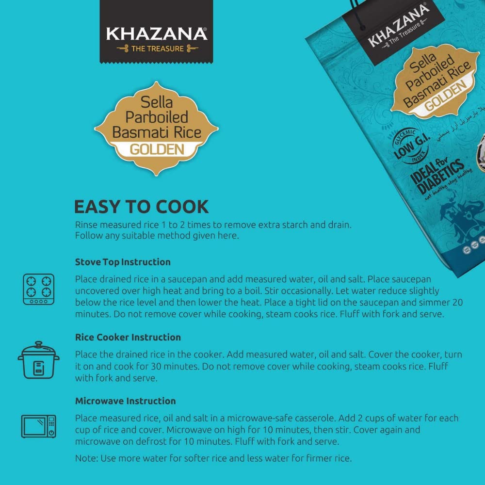 • Q: What dishes pair well with this rice? A: Khazana Authentic Golden Sella Parboiled Basmati Rice pairs exceptionally well with a variety of dishes, including curries, stir-fries, and other simmer sauces. Its flavorful grain enhances the taste of any meal.