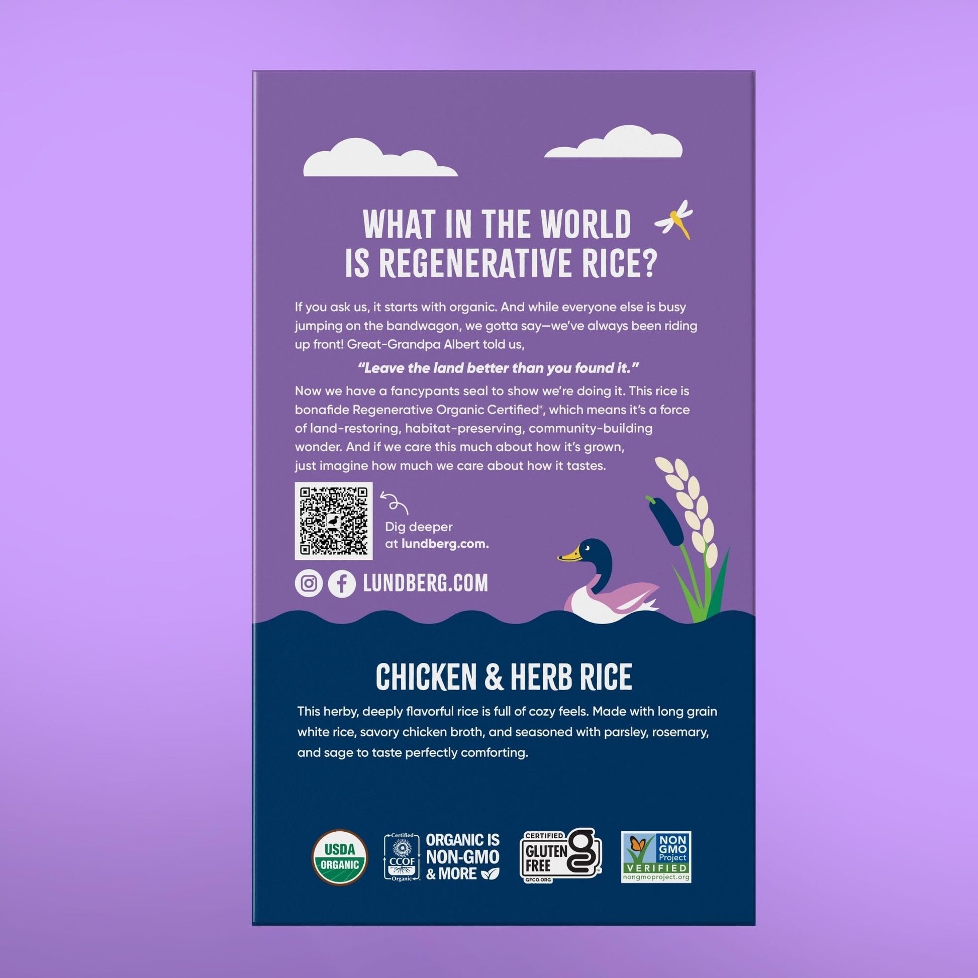 - Q: What makes Lundberg Organic Chicken & Herb Seasoned Rice unique? A: Lundberg Organic Chicken & Herb Seasoned Rice is unique due to its Regenerative Organic Certification, which emphasizes sustainable farming practices that promote biodiversity and healthy soils. This rice mix is also USDA Certified Organic, gluten-free, and made with clean, simple ingredients.