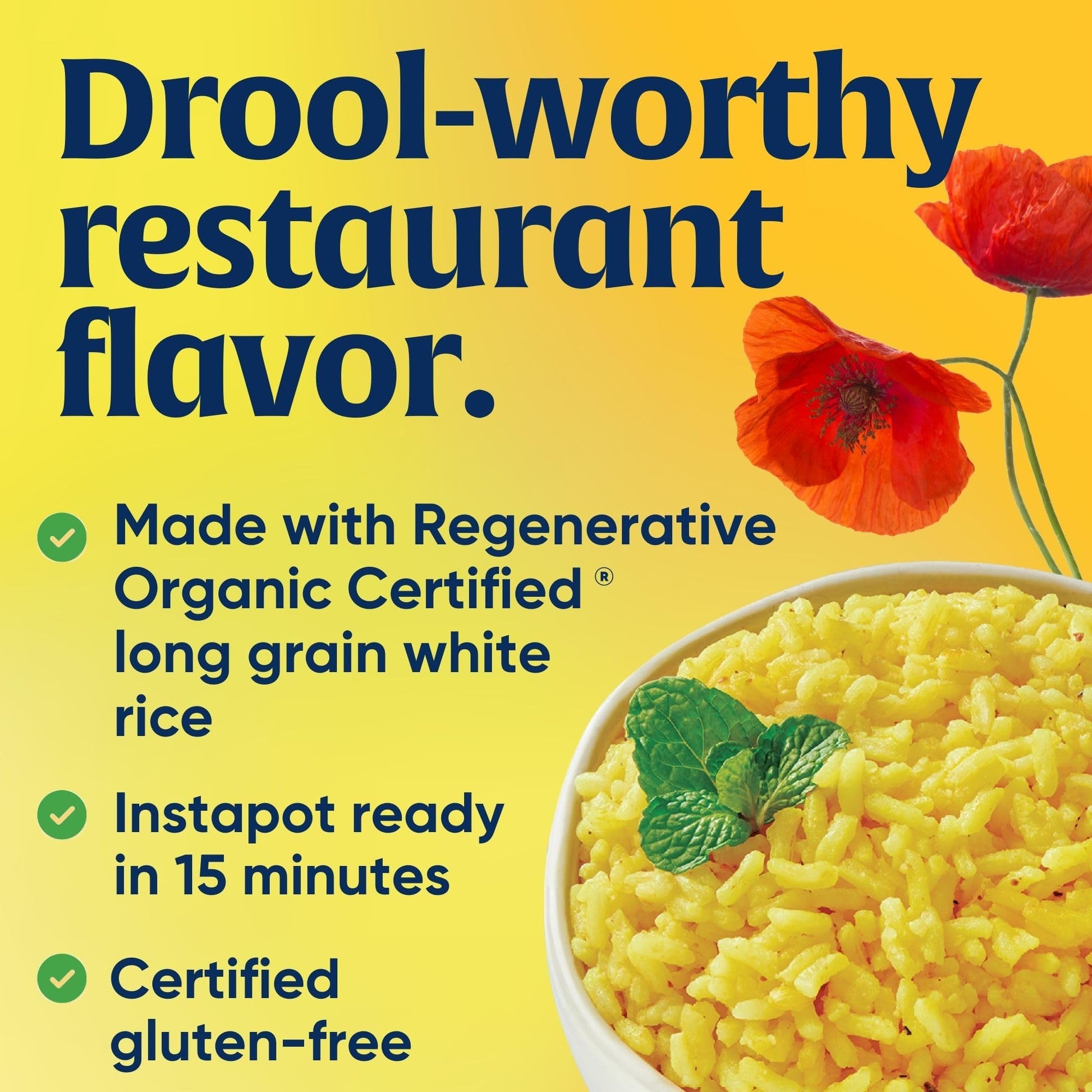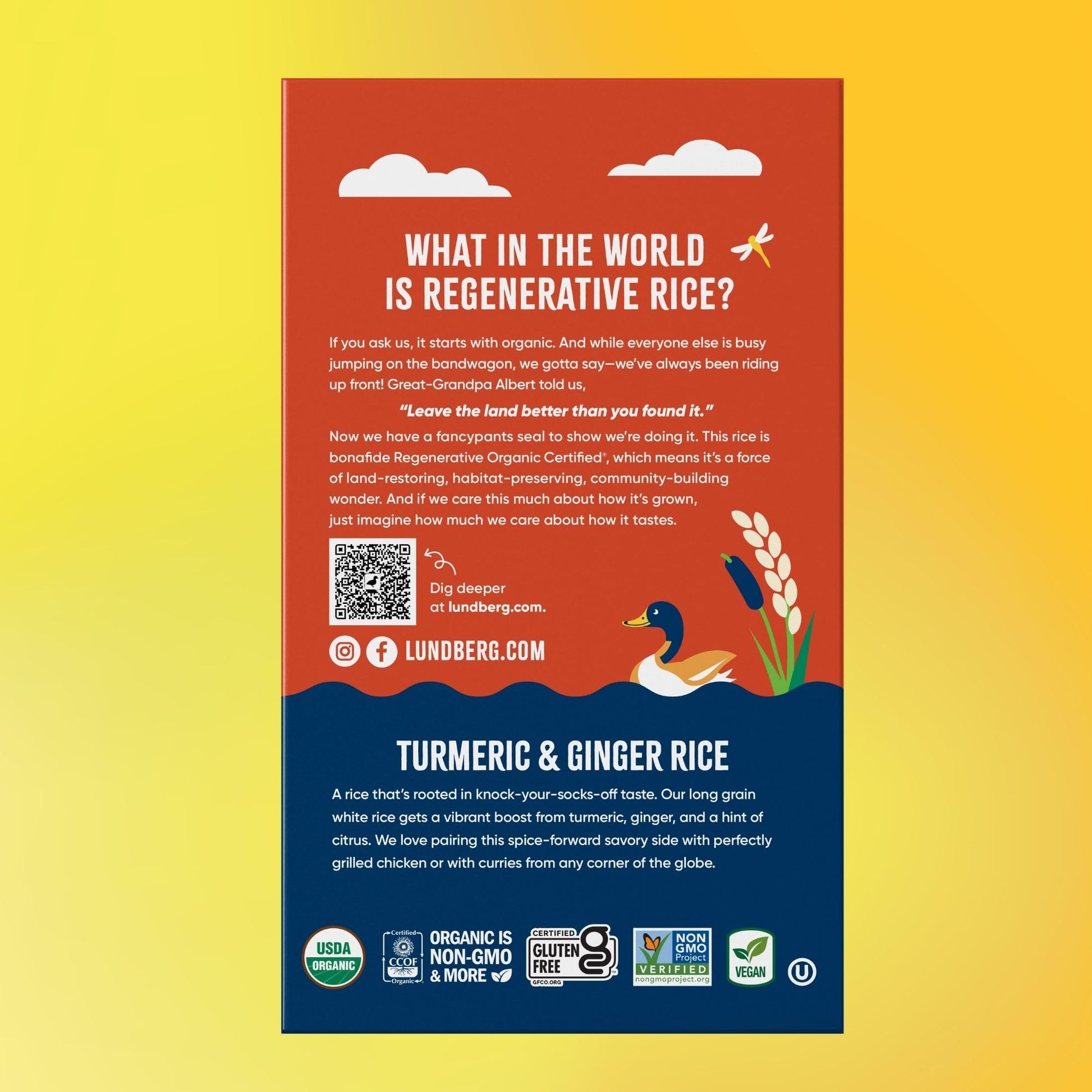 A Rice That'S Rooted In Knock-Your-Socks-Off Taste. Our Regenerative Organic Certified Long Grain White Rice Gets A Vibrant Boost From Turmeric, Ginger, And A Hint Of Citrus. We Love Pairing This Spice-Forward Savory Side With Perfectly Grilled Chicken Or With Curries From Any Corner Of The Globe. Since 1937, Lundberg Family Farms Has Been Growing Wholesome, Great-Tasting Rice While Tending To Soil, Air, Water, And Wildlife As Carefully As Our Crops. Some People Say We'Re A Bit Unconventional. But Doing Things Our Way - Sustainably At Every Step - Allows Us To Make Better Food For Your Table While Leaving A Better World For The Next Generation. Grown With Earth-Preserving Practices, Our 17+ Rice Varieties Are Cultivated To Maximize The Flavor Of Each Tiny Grain. Long, Short, Black, Brown, White, Red, And Blended. Each Variety Brings Something Different To The Table So You Can Get Creative In The Kitchen. Hungry For More Look For Other Great-Tasting Side Dishes, Rice Cakes, Snacks, And Packaged Rice Varieties From Lundberg Family Farms.