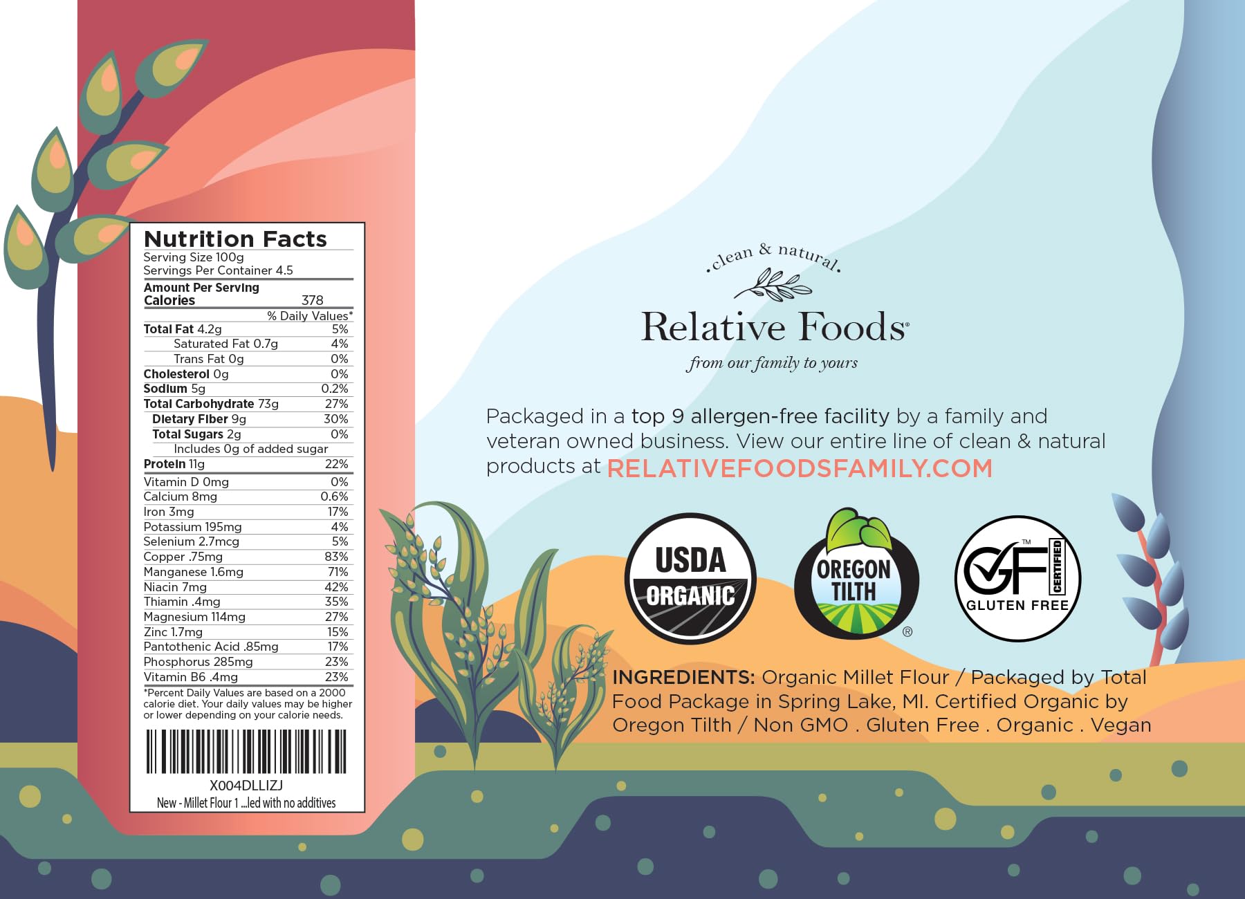 Relative Foods Millet Flour, Organic, 3 Pound Gluten-Free Baking Additive That Provides Extra Protein And Minerals Use Millet Flour As You Would All-Purpose Flour. Millet Is An Ancient Grain With An Impressive List Of Nutritional Benefits. To Start With, Its Naturally Gluten Free And Contains High Levels Of Protein For A Grain. Millet Consumption Has Been Linked To Improved Heart Health. This Is Because Of Its High Levels Of Magnesium And Potassium, As Well As Its Status As A Whole Grain. Millet Flour Has A Somewhat Sandy Texture And A Very Mild Flavor. When Mixed With Other Gluten Free Flours Like Rice Flour, Potato Starch And Sorghum Flour, It Creates A Very Palatable Flavor. Generally Speaking, 20% To 25% Is About As High As You Should Go With Millet Flour In A Recipe. Above That, And The Texture It Adds To Baked Goods Leads To Serious Crumbling Issues.